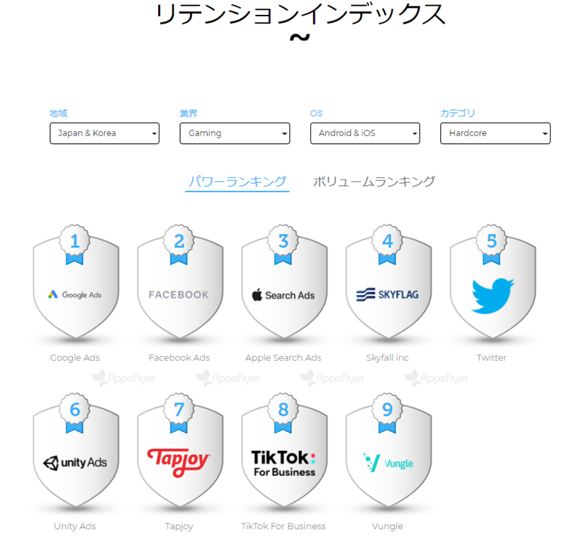 リテンション率の高いユーザーを獲得する能力についてメディアソースをランク付しています。