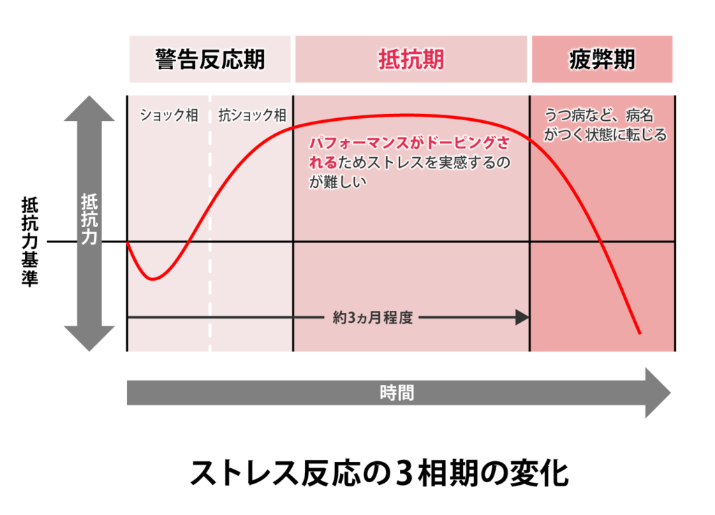 人はストレスを感じると、アドレナリンなどの抗ストレスホルモンを分泌し、一時的にパフォーマンスが向上します。その期間は「抵抗期」と呼ばれ、パフォーマンスが「ドーピング」されているような状態のため、それがストレスだと実感することは難しく、むしろ「調子がいい」とすら感じるケースも少なくありません。