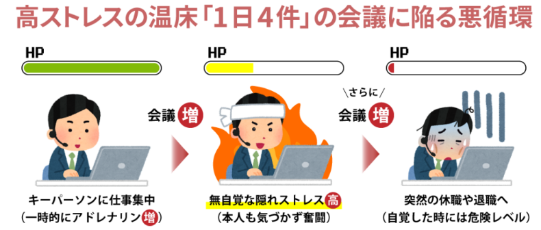 そのため、ドーピングされたパフォーマンスに惑わされることなく、ストレス自体を客観的に評価し、会議が一極集中する状態を回避することが重要になります。