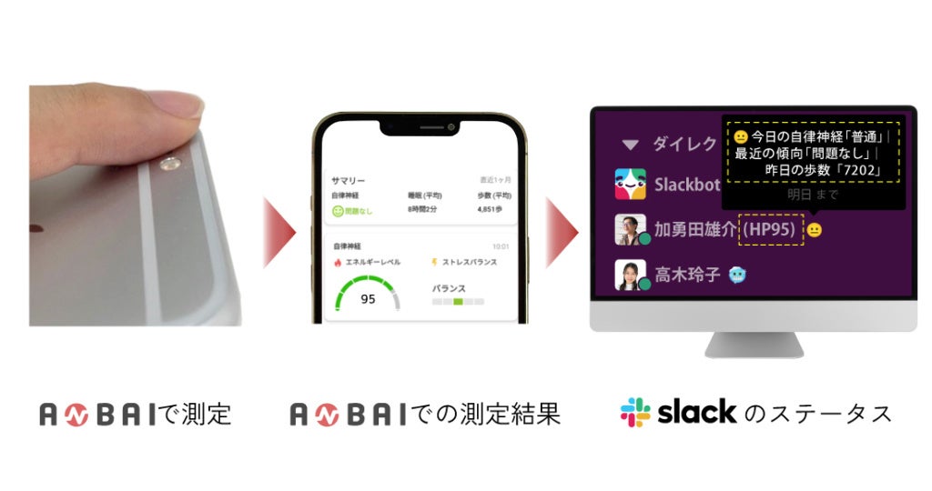 そこでDUMSCOでは、本人が自覚していないストレスを可視化するアプリ「ANBAI」のストレス評価を、任意でSlackのステータスに自動反映する人事制度「(忖度なしの)HP見える化」制度の運用を実験的に開始しました。