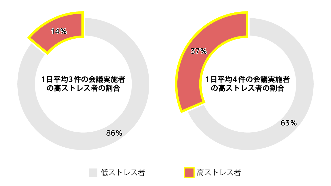 その結果、テレワークの推進で高ストレス者の割合は減少した一方で、1日4件以上の会議参加を境に、高ストレス者の割合が急増し、37%に達することが明らかになりました。