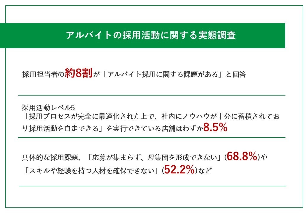 まず、小売業・飲食店の店舗責任者・エリアマネージャーの約8割が、アルバイト採用に関する「課題がある」と回答しており、具体的な採用課題として、「応募が集まらず、母集団を形成できない」(68.8%)などが上位課題として挙がりました。また、各店舗のアルバイトの採用活動のレベルは、「採用プロセスが完全に最適化された上で、社内にノウハウが十分に蓄積されており採用活動を自走できる」レベルは、8.5%に留まる結果となりました。アルバイトの採用活動を適切に実行できていない理由として、「採用業務が主務ではなく十分な時間を確保できないため」(44.2%)などが挙げられ、更に、現在依頼している求人広告代理店に対して「人材の定着までサポートしてくれない」や「特定の媒体しか提案されず、店舗ごとに最適な提案が不十分」などの理由で、約半数が「不満がある」と回答しています。