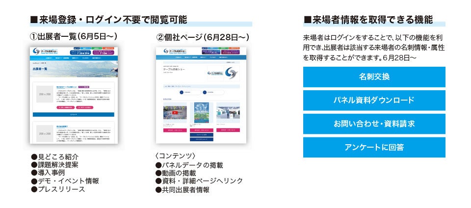 技術展示会への来場動機を促進し来場者をブースに誘致するためには、事前の展示内容紹介や課題解決提案が不可欠です。技術展示会出展者は、公式ウェブサイト内に各社の出展の見どころ紹介ができる「個社ページ」を持つことができます。個社ページでは見どころ紹介の他、パネルや動画を何点でも掲載することができます。来場者は来場登録やログイン不要で掲載内容を閲覧することができるため、ストレスなく情報収集をすることができ、技術展示会の関心度を高めます。