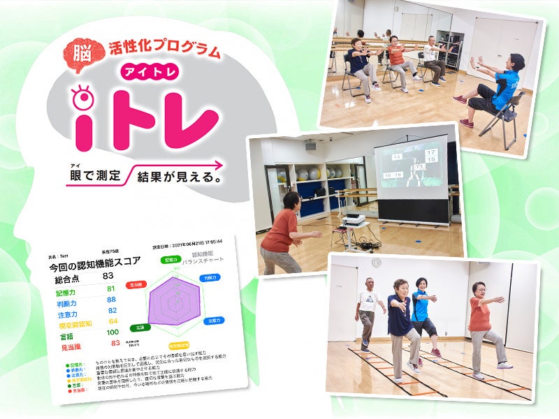 「iトレ」は、3分間画面を見るだけで認知機能を評価できるアイトラッキング式認知機能評価と、モーションセンサーによる全身を使ったゲーミフィケーションプログラムといった最先端技術に、同時に2つの動作を行うデュアルタスクトレーニングを組み合わせたフィットネス業界初のオリジナルプログラムです。