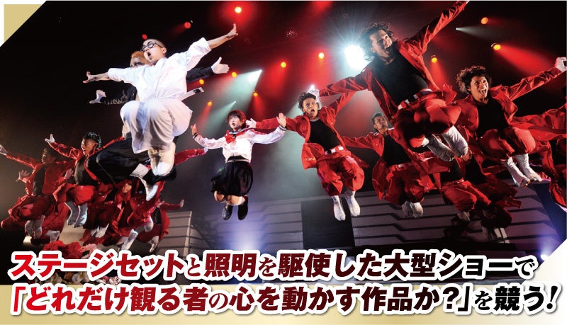 ミュージカルのような大人数ダンスショーを巨大ステージで実現し、コレオグラファーが魅せる才能を競いあう! ダンスの技術で競いあう従来型ダンスコンテストとはまったく異なるシステムにより、今やエンタメ業界も注目する最高峰のダンス・コンペティションとして名高いです。