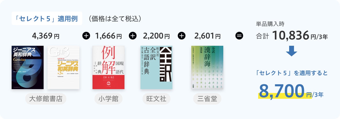 3年使用料の合計が10,836円となる「ジーニアス英和辞典・和英辞典(大修館書店)」「現代国語例解辞典(小学館)」「旺文社全訳古語辞典(旺文社)」「全訳 漢辞海(三省堂)」の5辞書は、「セレクト5」の適用により2,136円(約20%)安い8,700円となります。