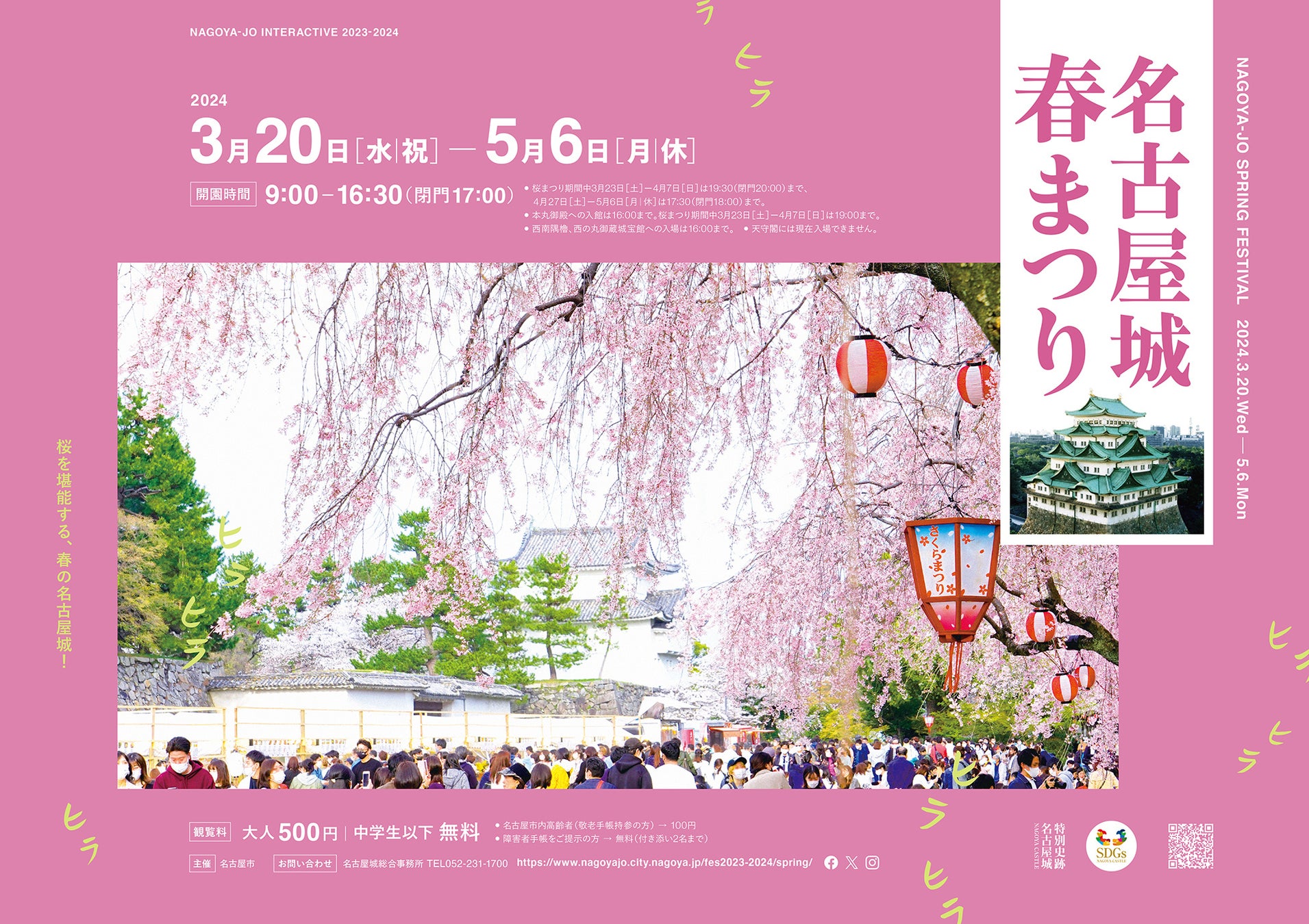 名古屋城では今年も城内に咲き誇る約900本の桜をはじめ、春の名古屋城をお楽しみいただく「名古屋城 春まつり」を開催いたします。夜桜ライトアップも行う「名古屋城桜まつり」をはじめ、「月亭八方落語会×呂布カルマライブ」や音楽ライブを行う初開催の「青空演芸場」などのイベント、「たべる あそぶ まなぶ」をテーマにした「金鯱座」などを展開。名古屋城ならではのさまざまなコンテンツで皆さまをお迎えいたします。