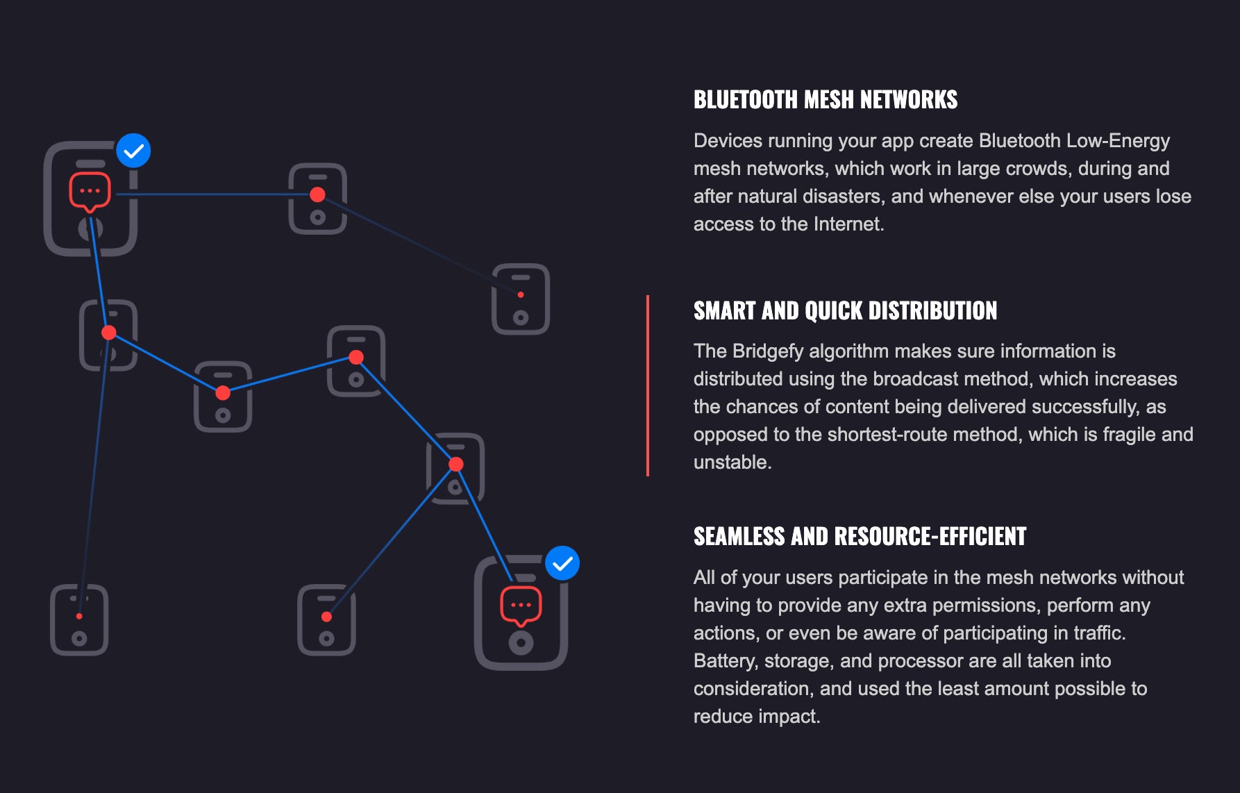 Bridgefy keeps people connected by providing a mobile messaging application that works without internet or phone data. It's software development kit easily integrates into iOS and Android apps, thus making them available to users, without the internet. Bridgefy increases engagement, reduces server usage, and can create new revenue streams fortexting, dating, gaming, ride-hailing, and many other types of apps.