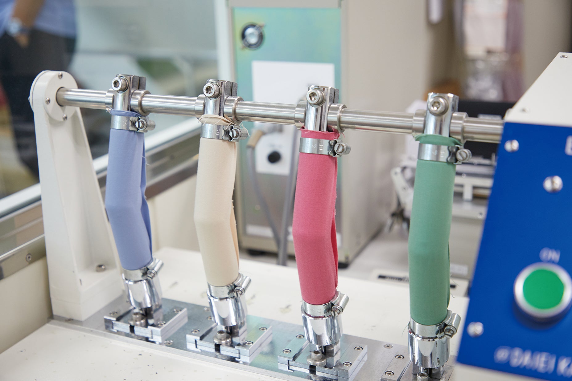 商品の開発には3〜5年の年月がかかります。これは、理想の360°ストレッチ生地をつくるため、糸から独自に開発し、肌ざわりや伸縮性などの検証実験を何度も繰り返し行っているからです。また、お客様に⻑く愛用していただくため、美脚研究所では素材の耐久性・縫製の精度など、品質を最優先にしたものづくりを行っております。