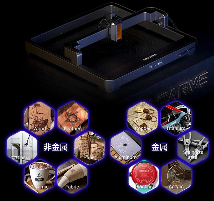 同じ本体で、紙や木材のカットはもちろん、プラスチックへの彫刻、ほとんどの金属も彫刻対象となる、素材に制約されないレーザー彫刻機となります。