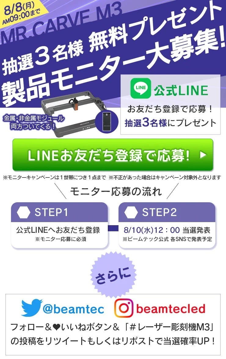 2022年8月1日(月)よりビームテック公式Instagram(https://www.instagram.com/invites/contact/?i=p8kdq8z5u3l&utm_content=2xx1tm2)、Twitter(https://twitter.com/@beamtec)、DAJAレーザーLINE公式アカウント(https://lin.ee/mMsUFcw)を通じてイベントを実施。
