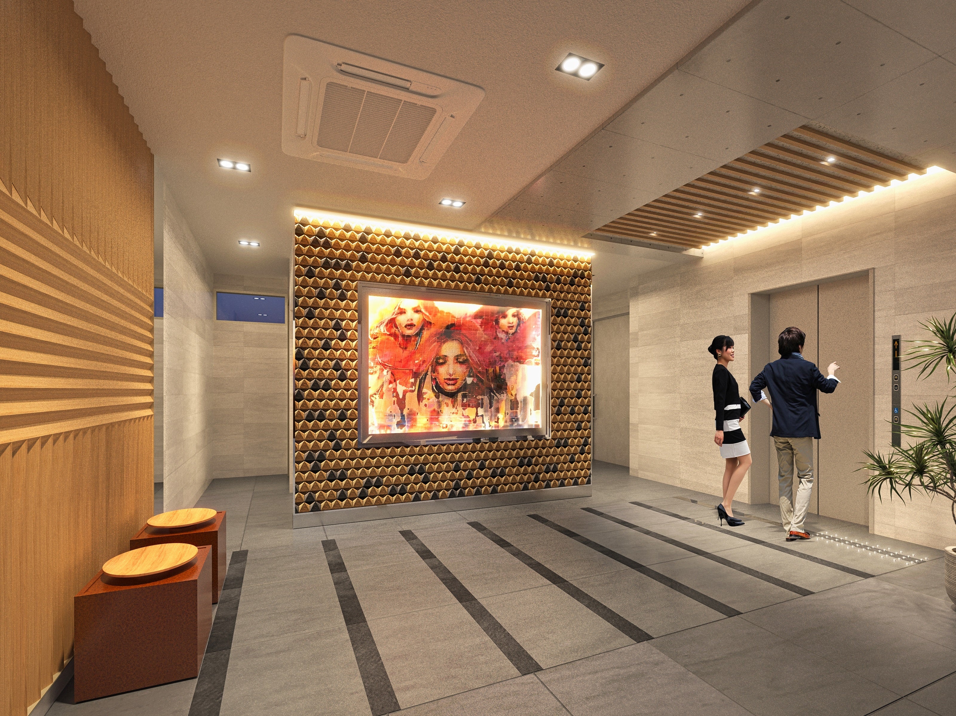 エントランスホール中央に近年注目されているアーティストの1人である女性イラストレーター吉田佳寿美(KATHMI)氏にこの世で1つだけのオリジナルアートの制作を依頼しました。吉田氏が好んで描かれる、心に芯を持ち、自立して生きていて、自分の信念を持っている力強い目を持った女性モチーフに、見た人の心が躍るような、心が豊かになれるようなアートを制作していただきます。日常の動線の中で働く人が心地よい高揚感に包まれる象徴的な空間に仕上げます。