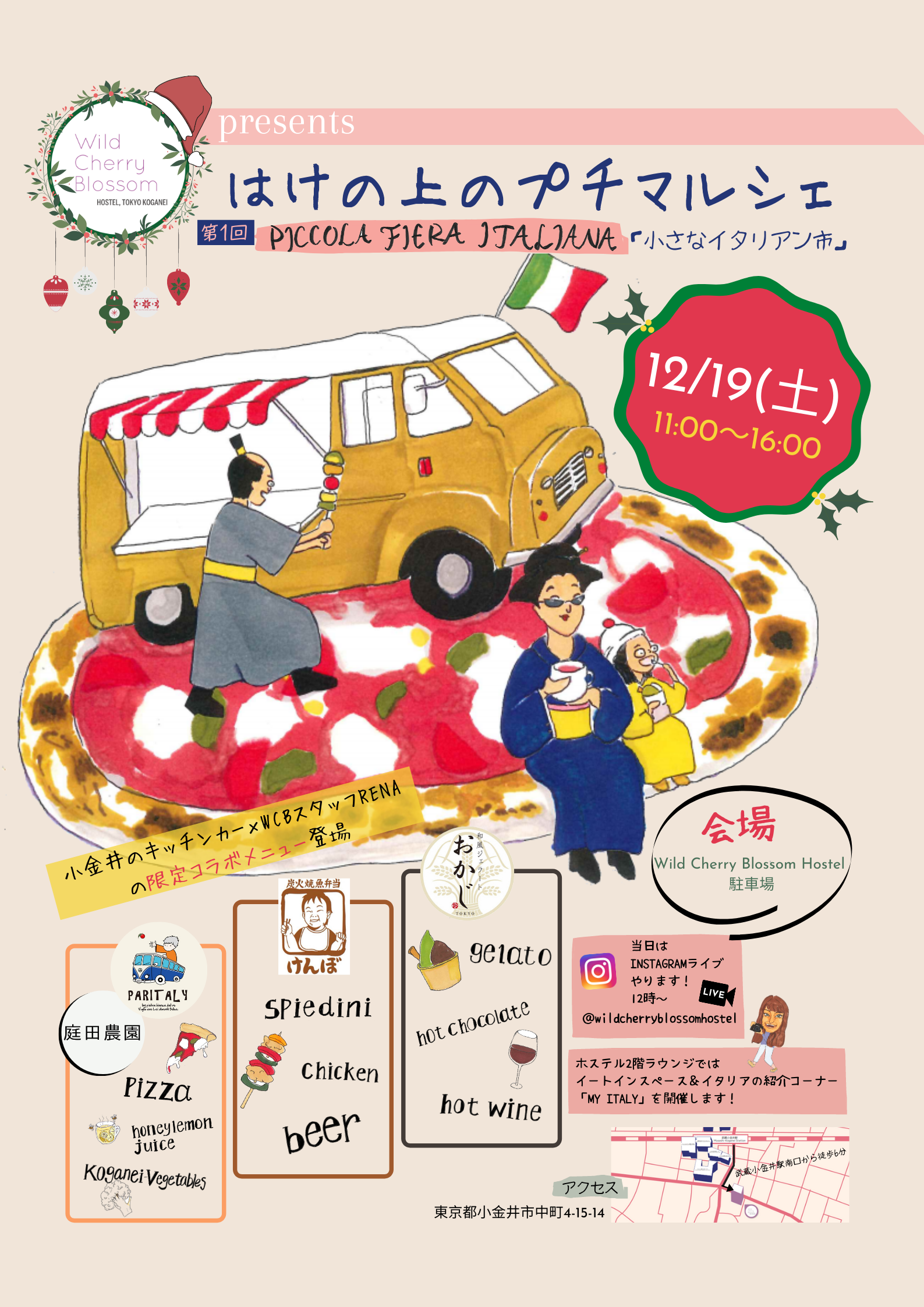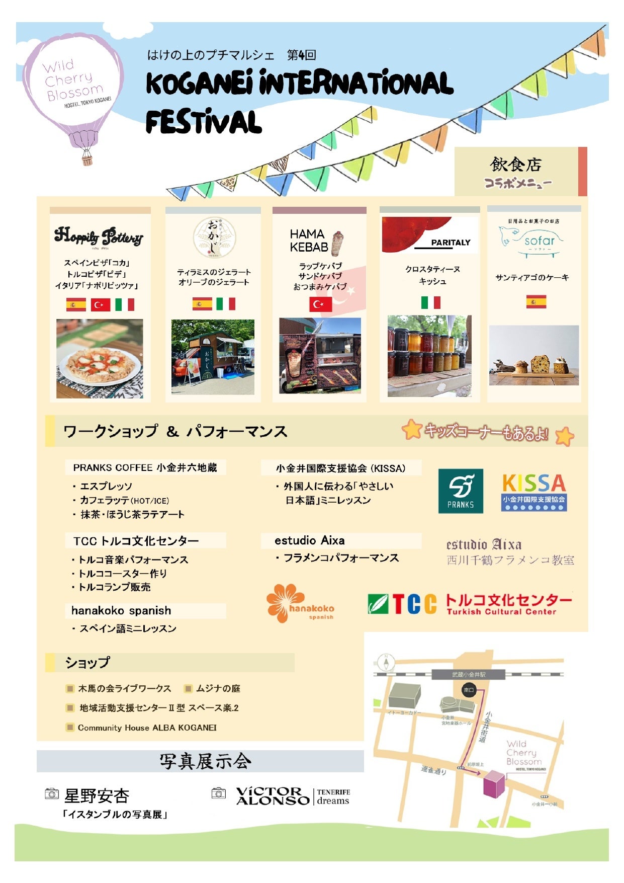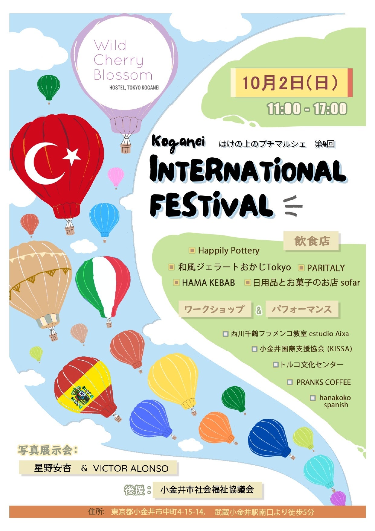 「Wild Cherry Blossom- HOSTEL,TOKYO KOGANEI-」では、イタリア・トルコ・スペイン出身のスタッフが中心となって、地域の飲食店、事業者らとタイアップ。キッチンカーでは、この日限定のコラボメニューなども登場。その他にもラテアート体験、スペイン語ミニレッスン、フォトグラファーによる各国の写真展示、民族楽器演奏やダンスショー、キッズ向けワークショップなどが開催され、大人も子供も3ヶ国を縦横無尽に楽しむことができるイベントとなっています。