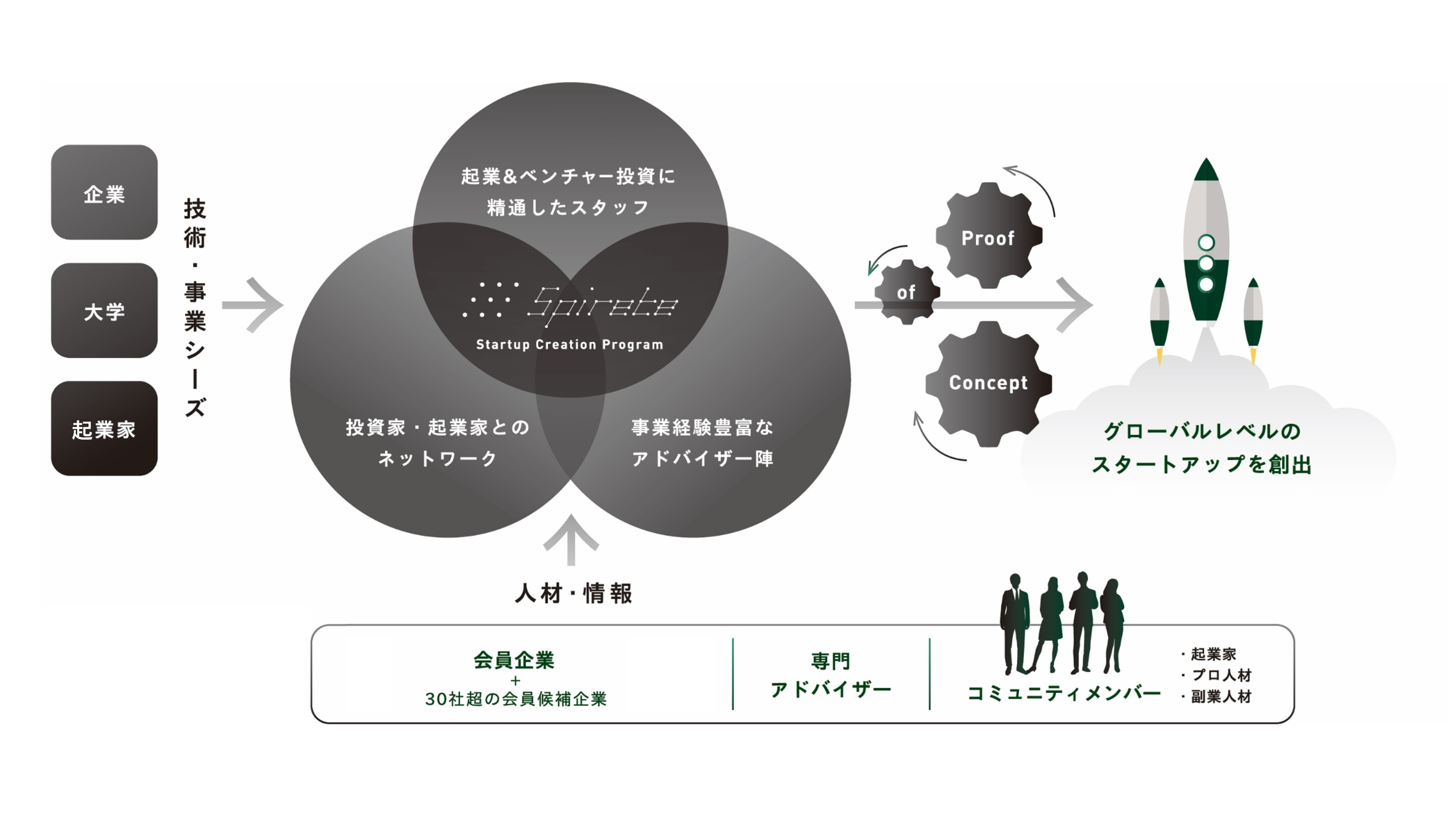 Spirete起業プログラムは、異業種の人材やノウハウを混ぜ、新たな事業展開、意思決定の迅速化、外部からのリスクマネーの調達を通じて、実現が難しかった 最大限の事業成長の加速を狙います。現在、このプログラムには以下の事業会社のほか、企業や大学研究機関の人材、フリーランスなど約100名のメンバーが集まっています。