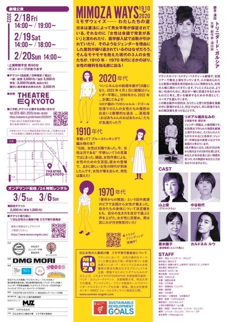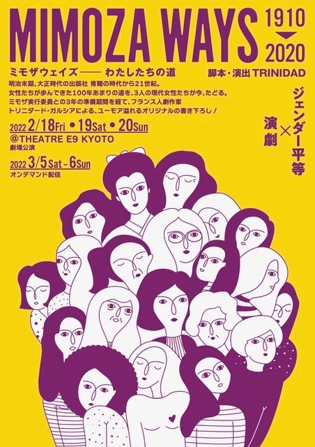 フランスにおいて、女性の権利をテーマにした舞台で高い評価を得ている脚本家・演出家トリニダード・ガルシアとミモザ実行委員が、女性たちに出会いインタビューや研究を重ねて書き上げた戯曲「MIMOZA WAYS 1910-2020」。1910年代から現代までの日本社会を彼女ならではの視点で描いた本作を、2022年2月、京都で舞台化します。トリニダードの風刺やユーモアの技法で、それぞれの時代背景や、鑑賞者の自らの立ち位置を知らせ、元気にしてくれる演劇製作を目指しています。