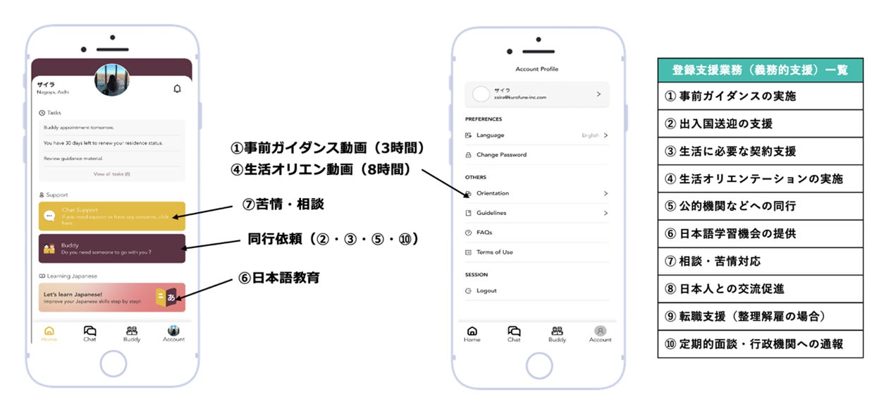 KUROFUNEは現在2つのアプリを運用しています。在日外国人に対して、日本での就職活動を支援するアプリ「KUROFUNE」と、2019年4月から運用が始まった特定技能労働者の法的支援と定着支援をアプリ上で行う「KUROFUNE PASSPORT」です。