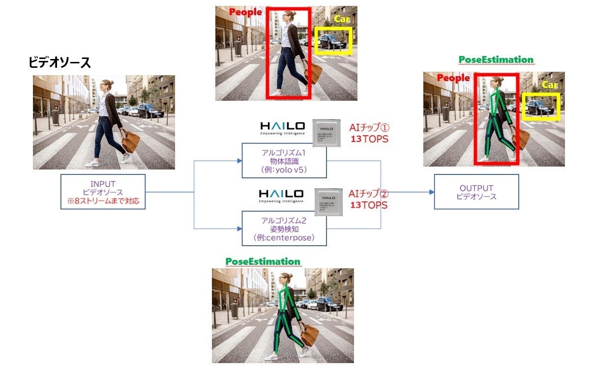 AT-IPCFG005では、複数のHailo-8™ AIチップを搭載することで、ソースに対して『複数のアルゴリズムを同時に適用する』ことが可能となりました。
