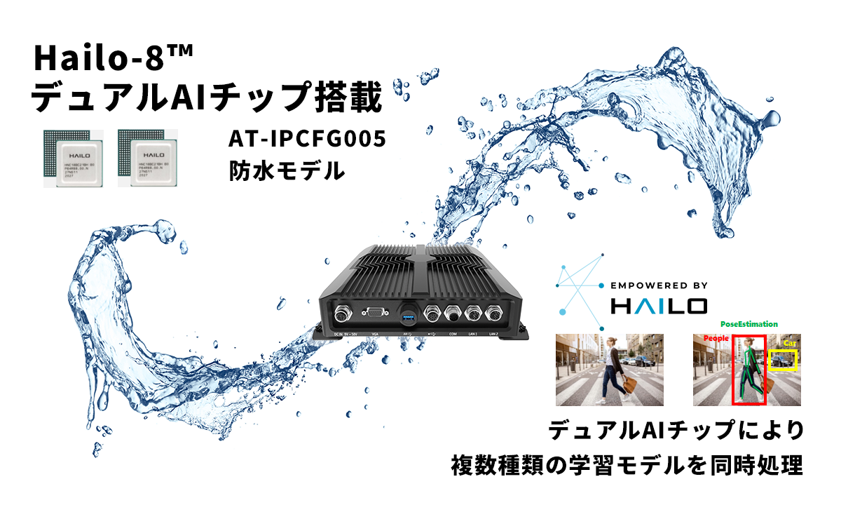 リリースした『AT-IPCFG005』は、産業向けの高性能AIチップを2基搭載し、エリア認識と物体認識、物体認識と姿勢推定など、種類の違う学習モデルを同時に適用することで、AIの推論機能を拡張することができる、耐環境性能に優れた産業用コンピュータです。