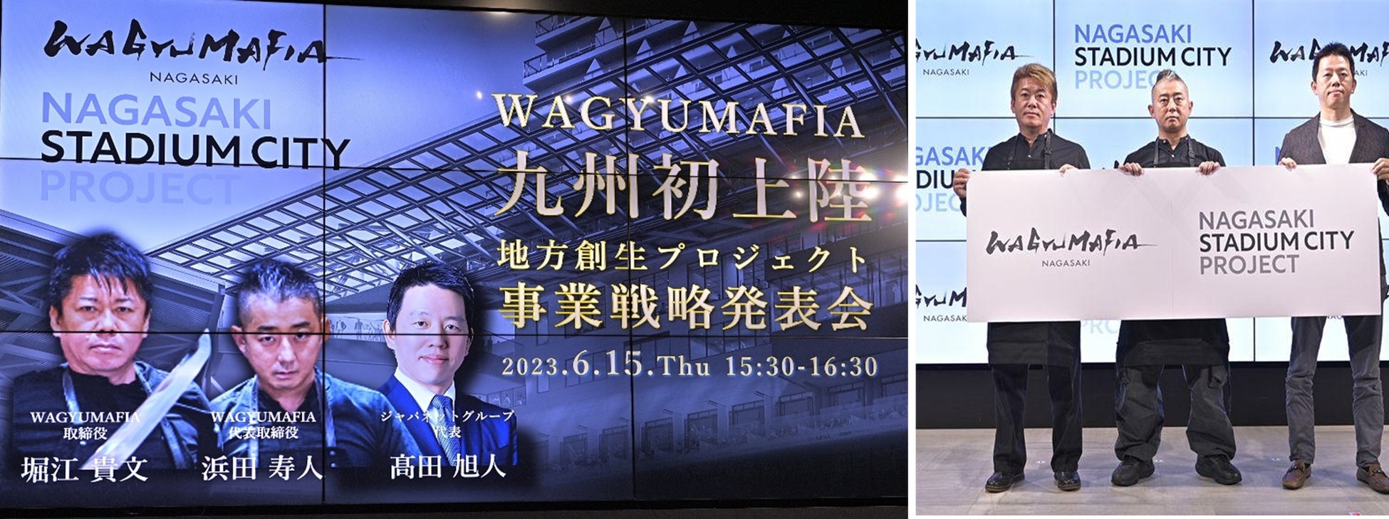 このプロジェクトの始動に際して「『WAGYUMAFIA』九州初上陸 地方創生プロジェクト事業戦略発表会」を2023年6月15日(木)に、ベクトルスタジオ(東京都港区)で実施しました。当発表会ではWAGYUMAFIA株式会社 代表取締役 浜田 寿人、取締役 堀江 貴文による事業戦略が発表され、ジャパネットグループ代表 髙田 旭人氏からは長崎スタジアムシティプロジェクトについて発表がありました。