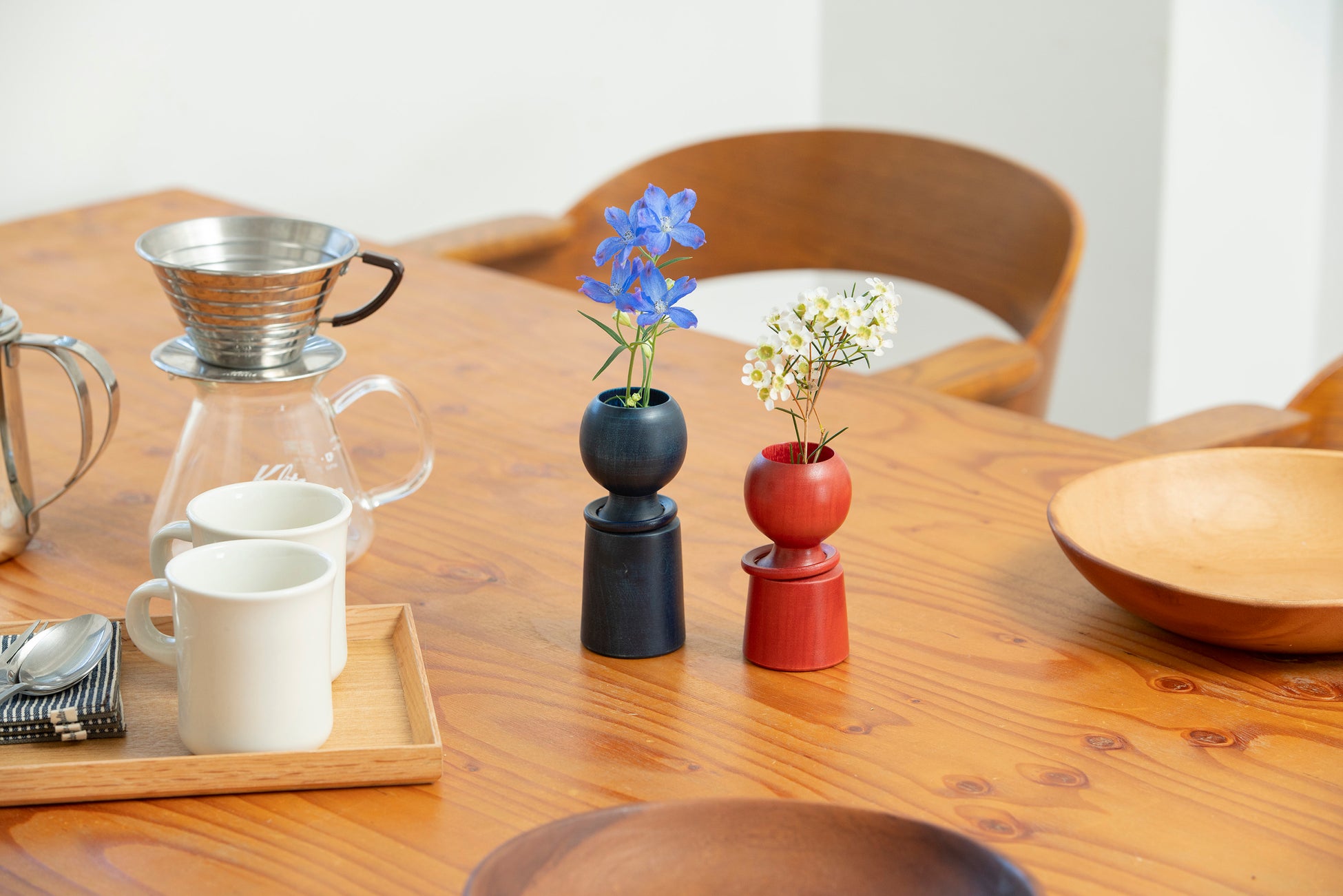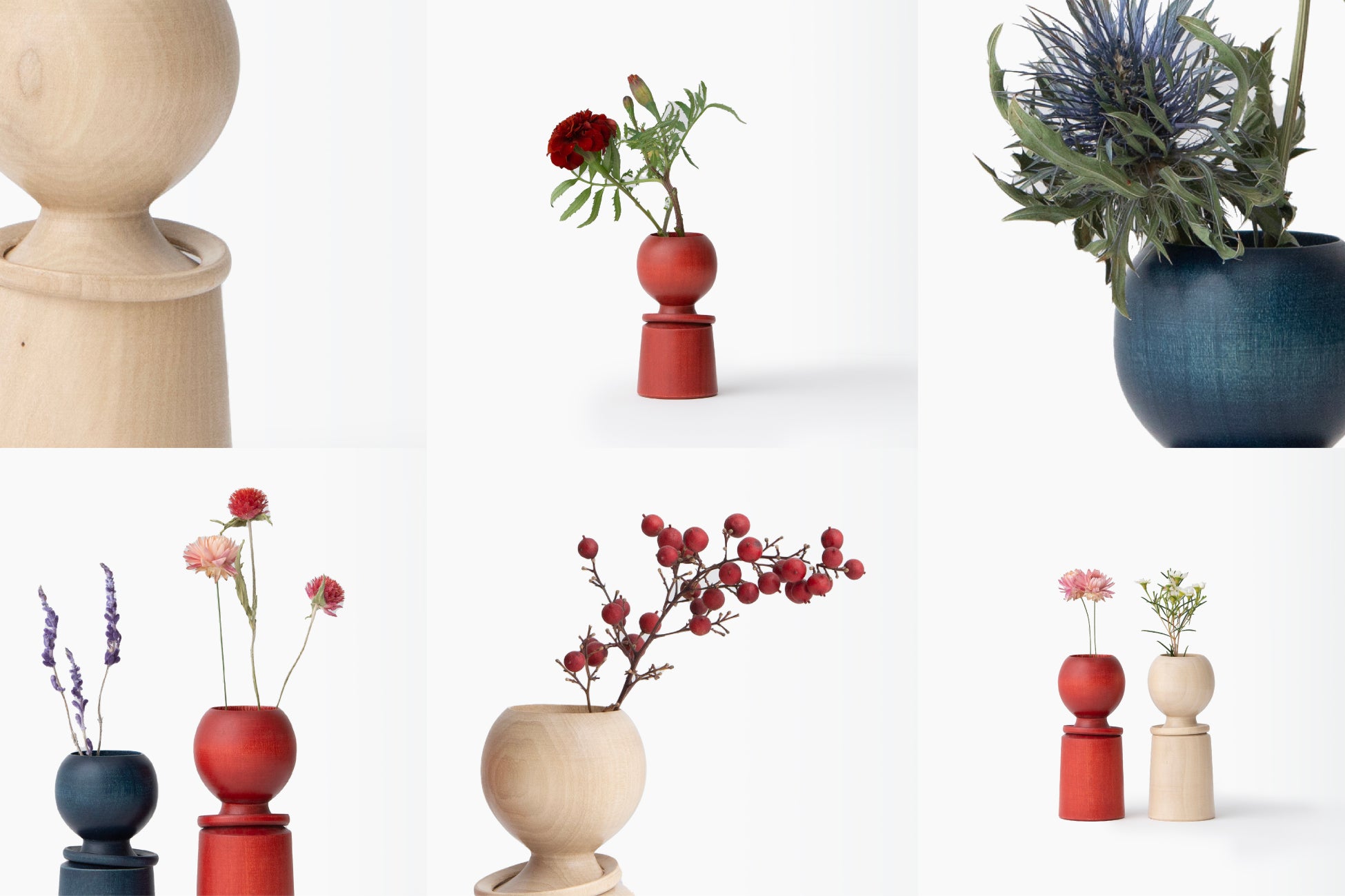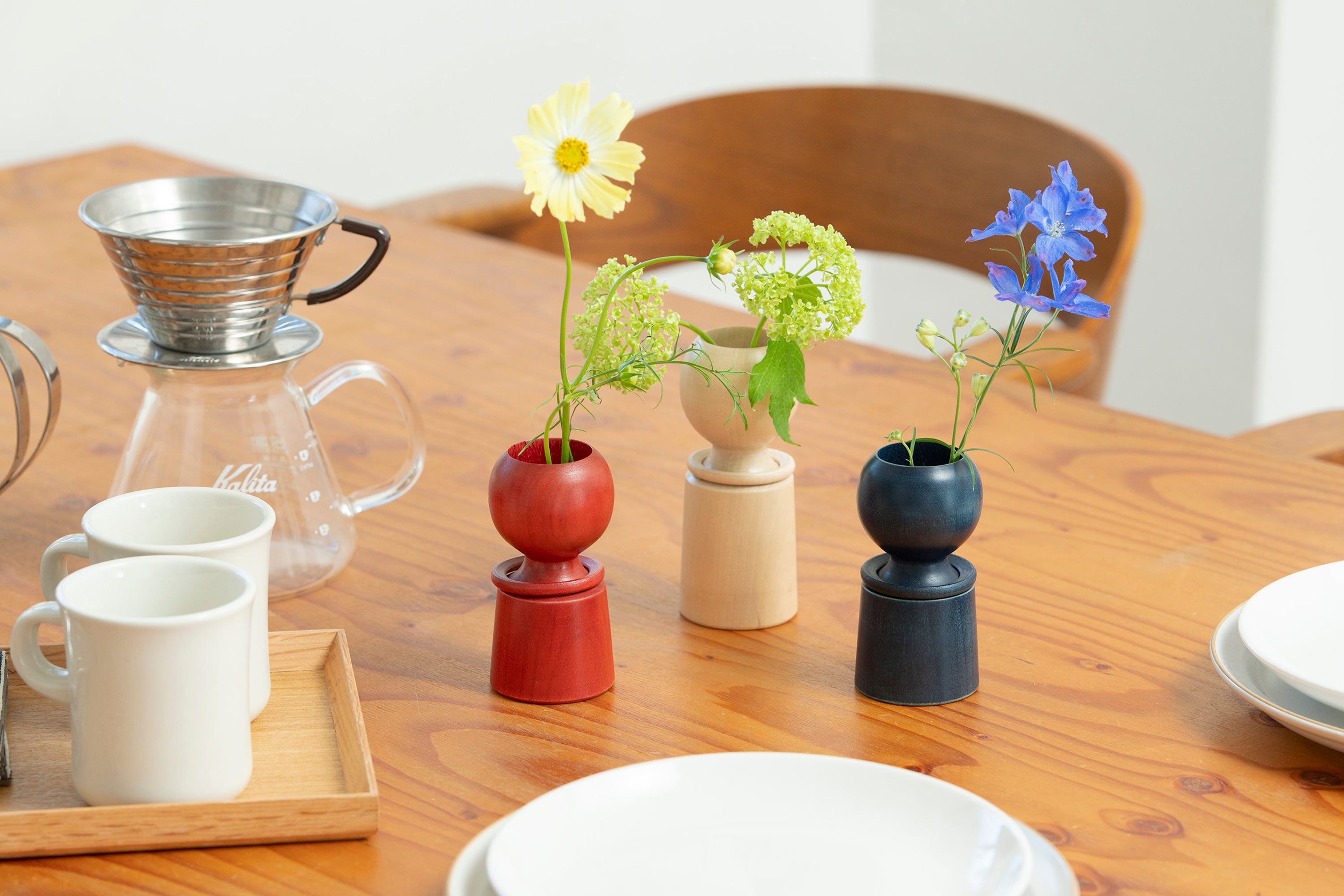 こけしを手がけるのは、「東京こけし」と銘打って八王子で40年余りこけしを作り続けてきた挽物の熟練職人。さらに、白さ際立つ無垢のこけしに、美しい色を吹き込んだのは、台東区蔵前でアトリエ兼ショップを構える天然染色、草木染めの職人。2つの技が出会い技が織りなされた、草花を彩るための一輪挿しの優しいこけしが生まれました。