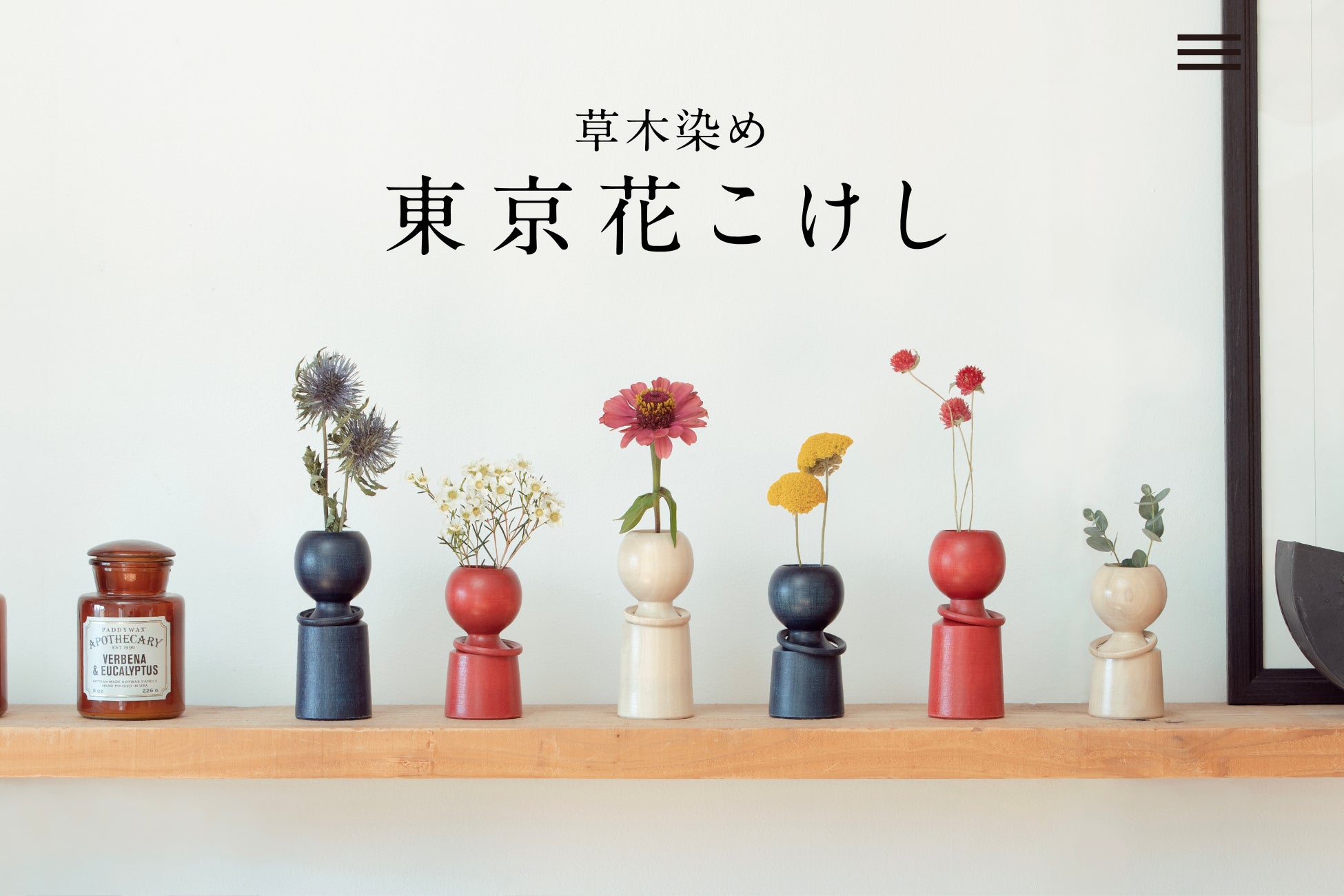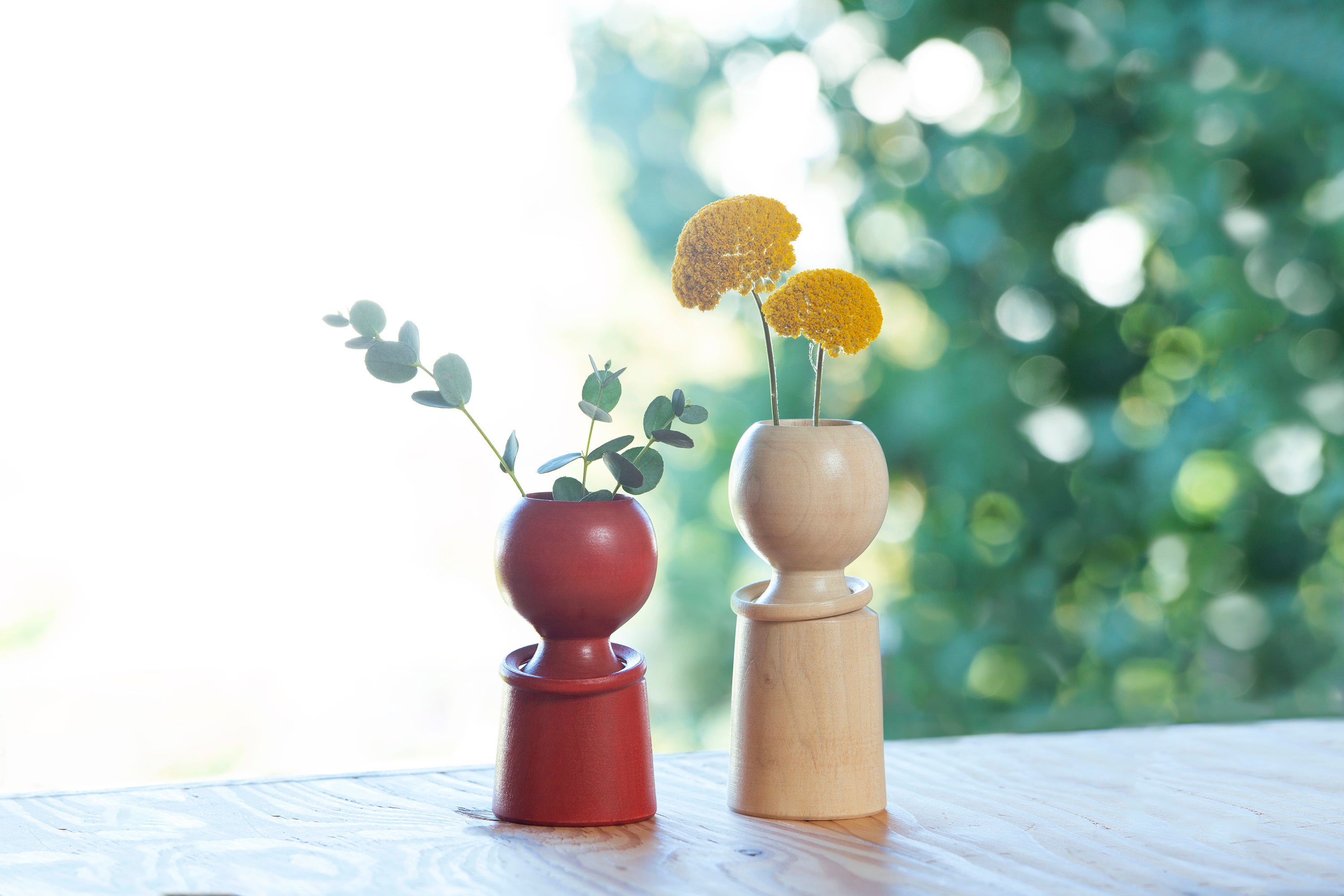 天然木から生まれた唯一のカタチと、自然の風合い豊かな色合いが美しい「草木染め 東京花こけし」。一輪挿しで優しく暮らしを彩るこけしが誕生。