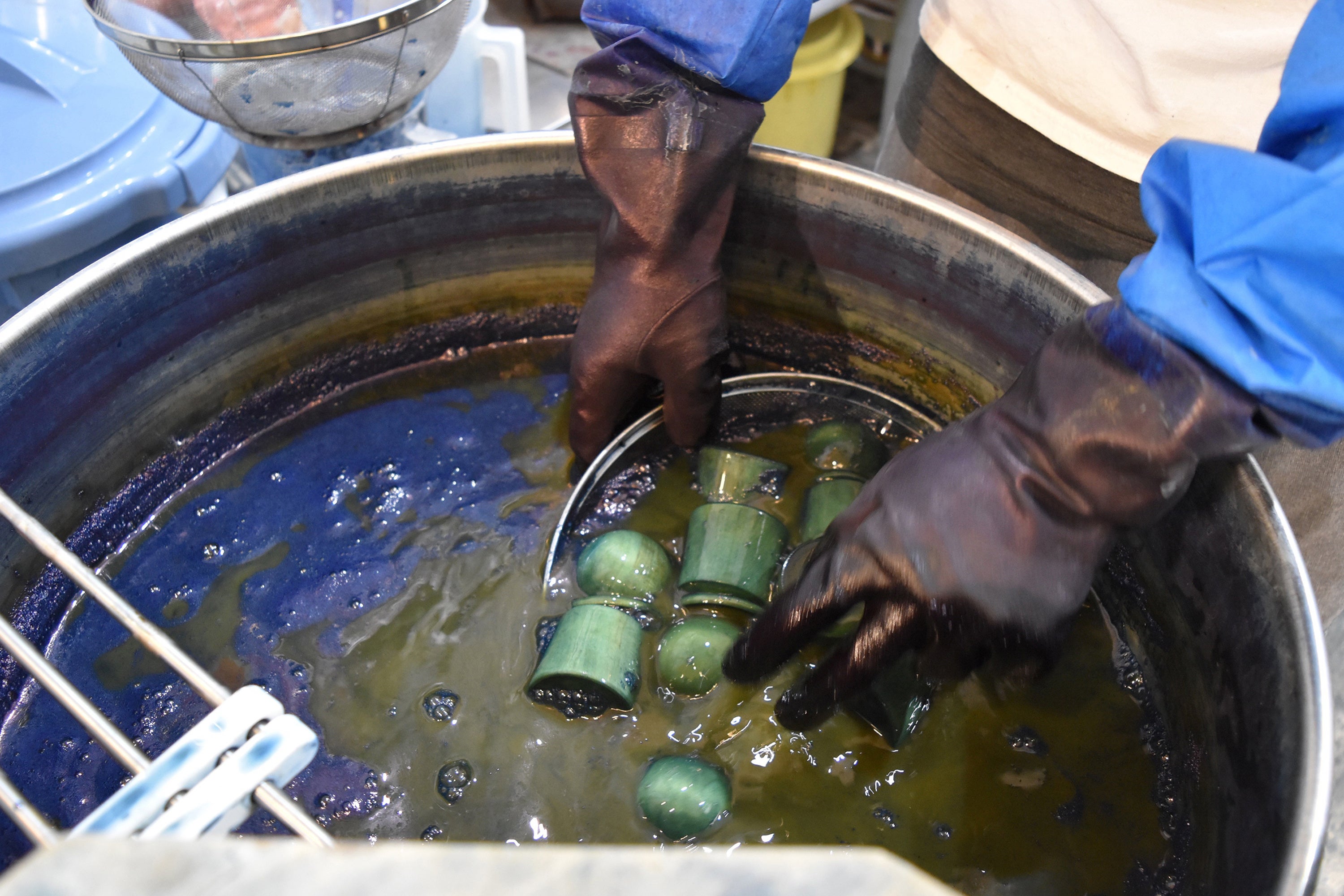 藍一つとっても、染め方も色々、さらに濃淡の色合いで藍の呼び名もさまざま。濃い藍を出すためには