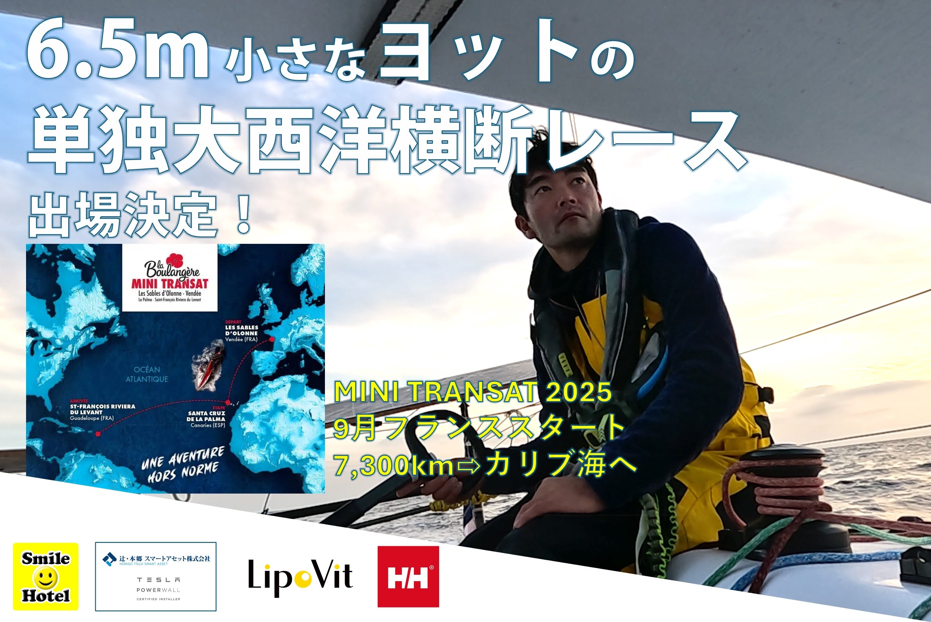 48年の歴史の単独大西洋横断レース「Mini Transat」に出場決定。小型ヨットで約7,300kmを航海。4社とスポンサー契約締結。クラウドファンディングも開始。是非お問い合わせください。