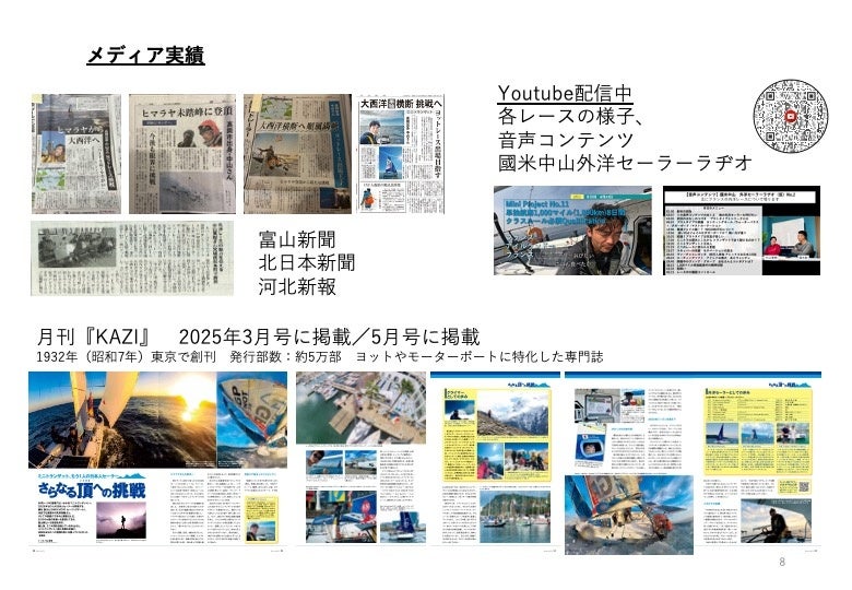 外洋セーラー・登山家である中山寛樹(なかやまひろき、富山県高岡市出身 1983年生まれ)は、2025年に開催される単独・大西洋横断ヨットレース「Mini Transat 2025(ミニトランザット)」への出場が決定し、以下の4社とスポンサー契約を締結いたしました。