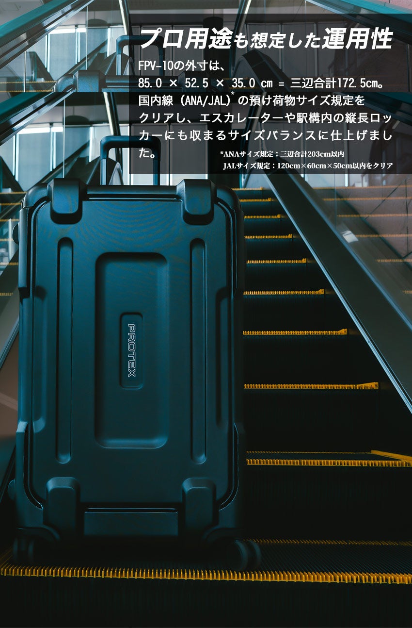 今回新たに開発したFPV-10は、スーツケースとして1週間~10泊程度の荷物を収容可能な約108Lの大容量に、縦内寸約78.5cmの長尺収容に対応しています。