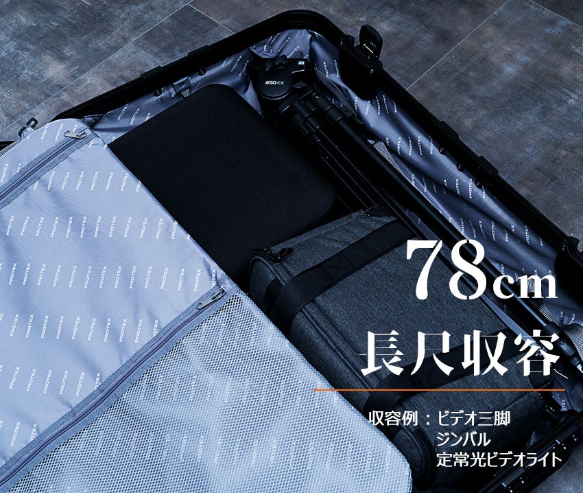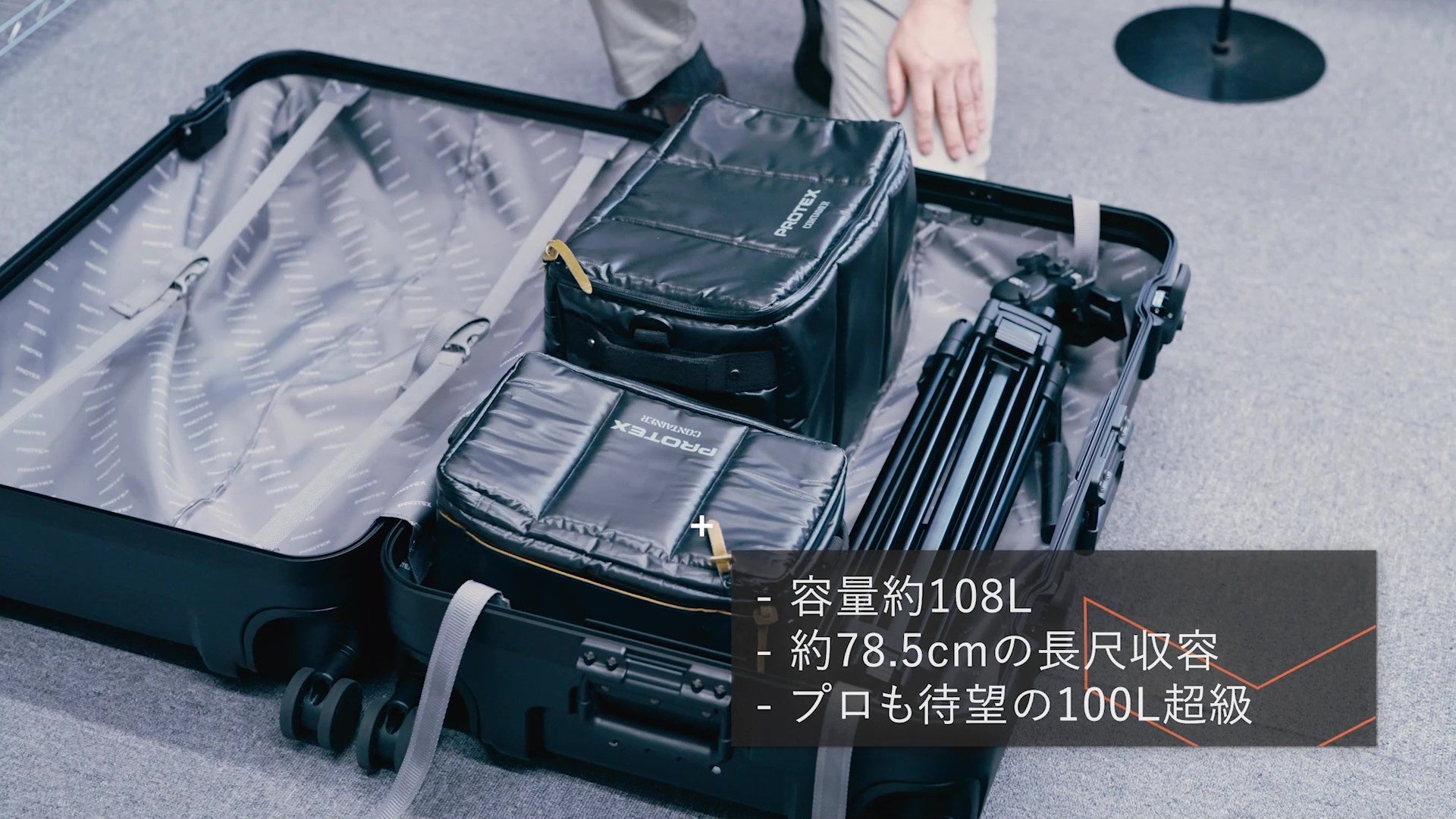 108Lの大容量に、ビデオ三脚も収容可能な仕舞寸法