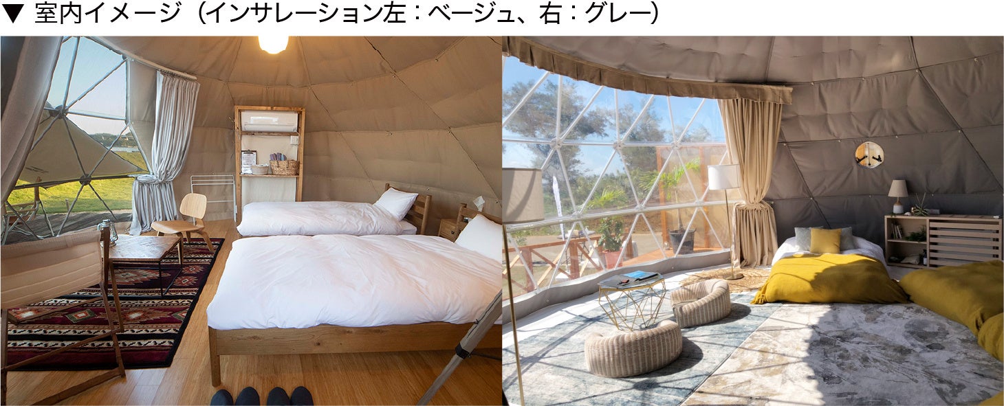 スタンダードドームテントが、カバー(外幕)4色、インサレーション(内幕)8色、国産防炎カーテン52色、ドア10色のカラー選択が可能になり、よりカスタマイズ出来るようになりました。さらに、ベンチレーション(通気口)に換気扇も追加して標準装備に。設置箇所も1箇所から2箇所に増やし、室内をより快適な空間にします。カバーデザインは弊社ですでにレイアウトしているものを採用することで、通常のドームテントよりも短納期・特別価格にて提供します。