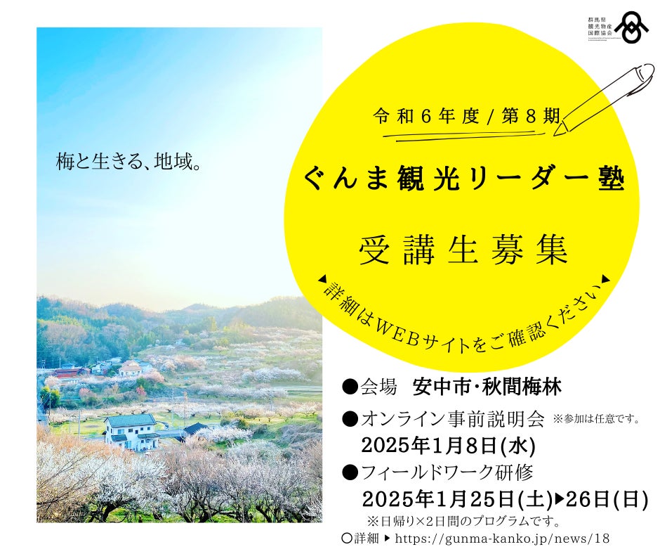 公益財団法人群馬県観光物産国際協会(所在地:群馬県前橋市、理事長:岩﨑真人)では、令和6年度『ぐんま観光リーダー塾』(第8期)を開講し、受講生を募集いたします。本塾は、「地域の課題を解決するための”観光地域づくり”」に興味・関心があり、自ら取り組む意欲のある方を対象に実施いたします。実際の地域をフィールドワークの舞台として、地域づくりの支援や地域の課題解決の糸口を見つけ、ありたい姿の実現を後押しするワークショップ形式を予定しています。