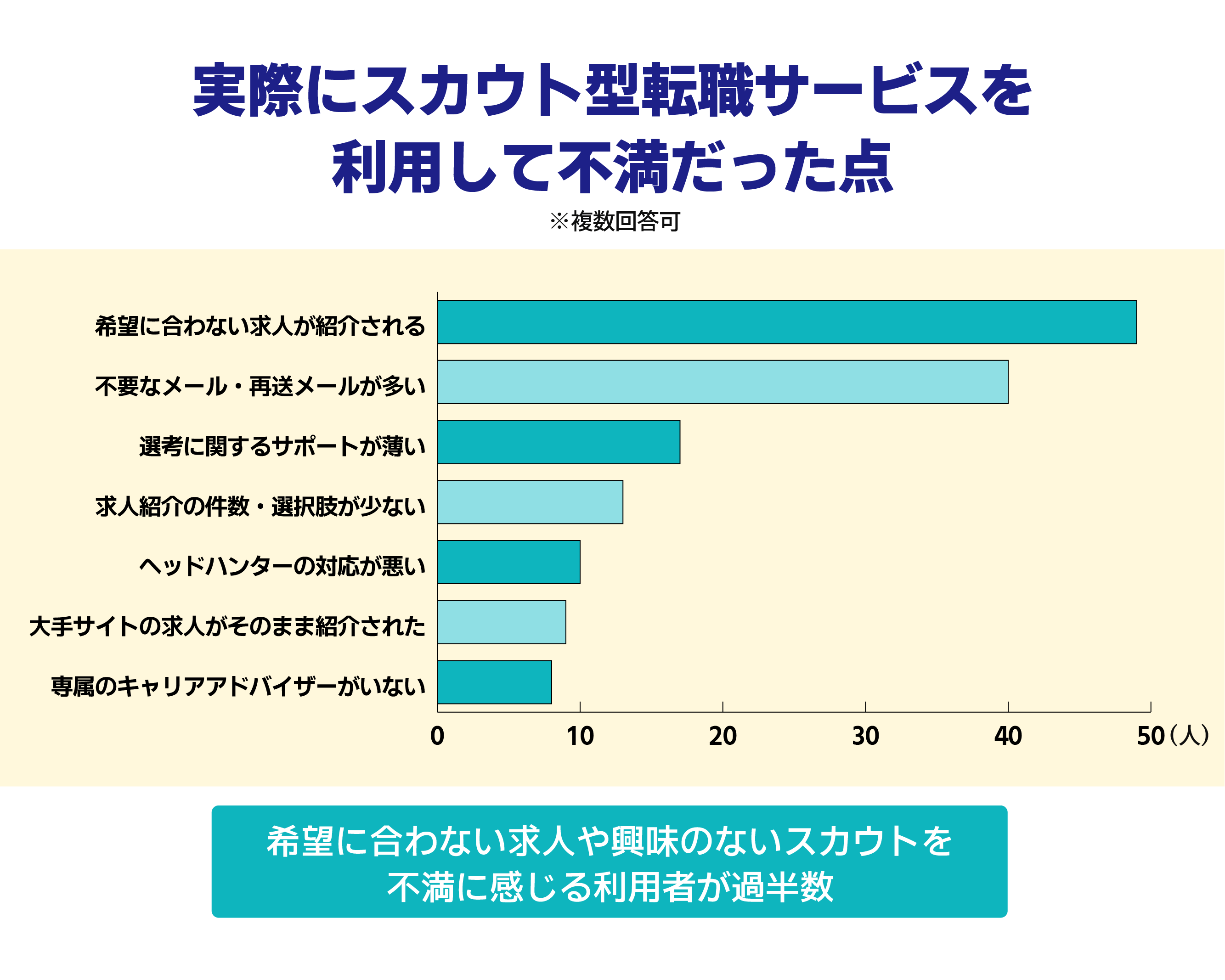 アンケート結果では、スカウト・オファー型転職サイトへの不満として「希望に合わない求人紹介」「不要なメール」が多いと感じる方が多数派でした。