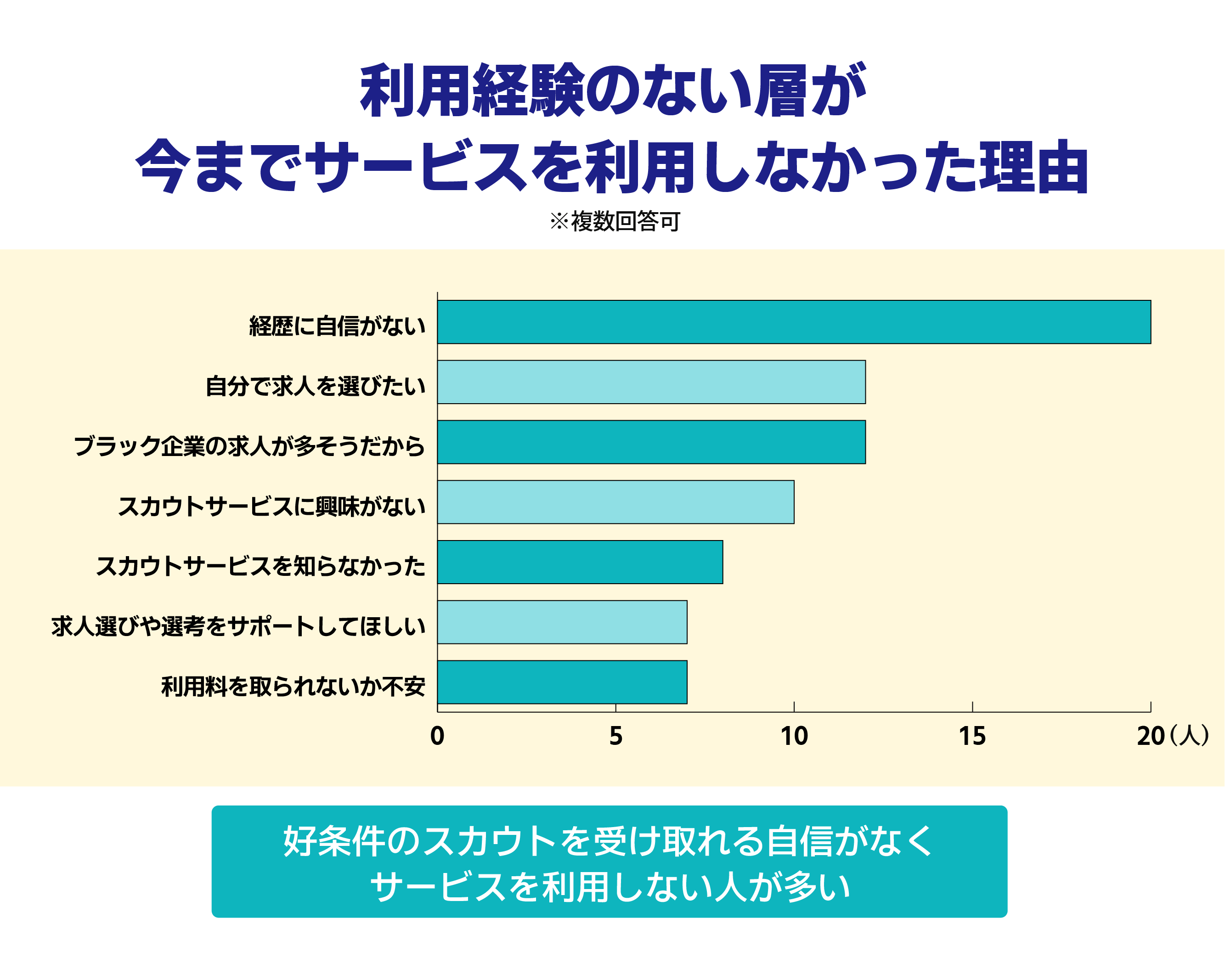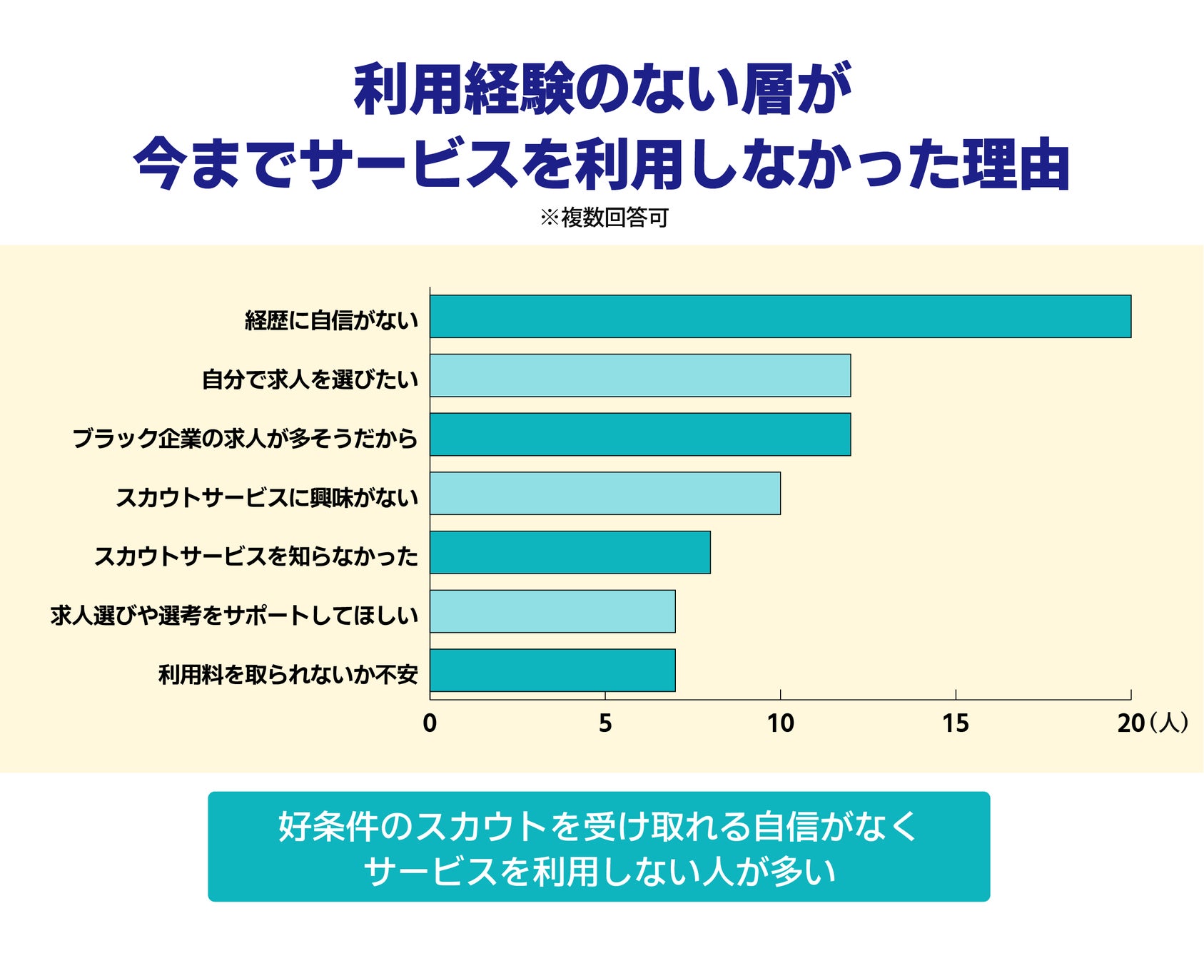 スカウトサービスを利用しなかった理由として多かったのは「経歴に自信がない」20名(16%)、「自分で求人を選びたい」12名(10%)、「ブラックな求人が多そう」12名(10%)。
