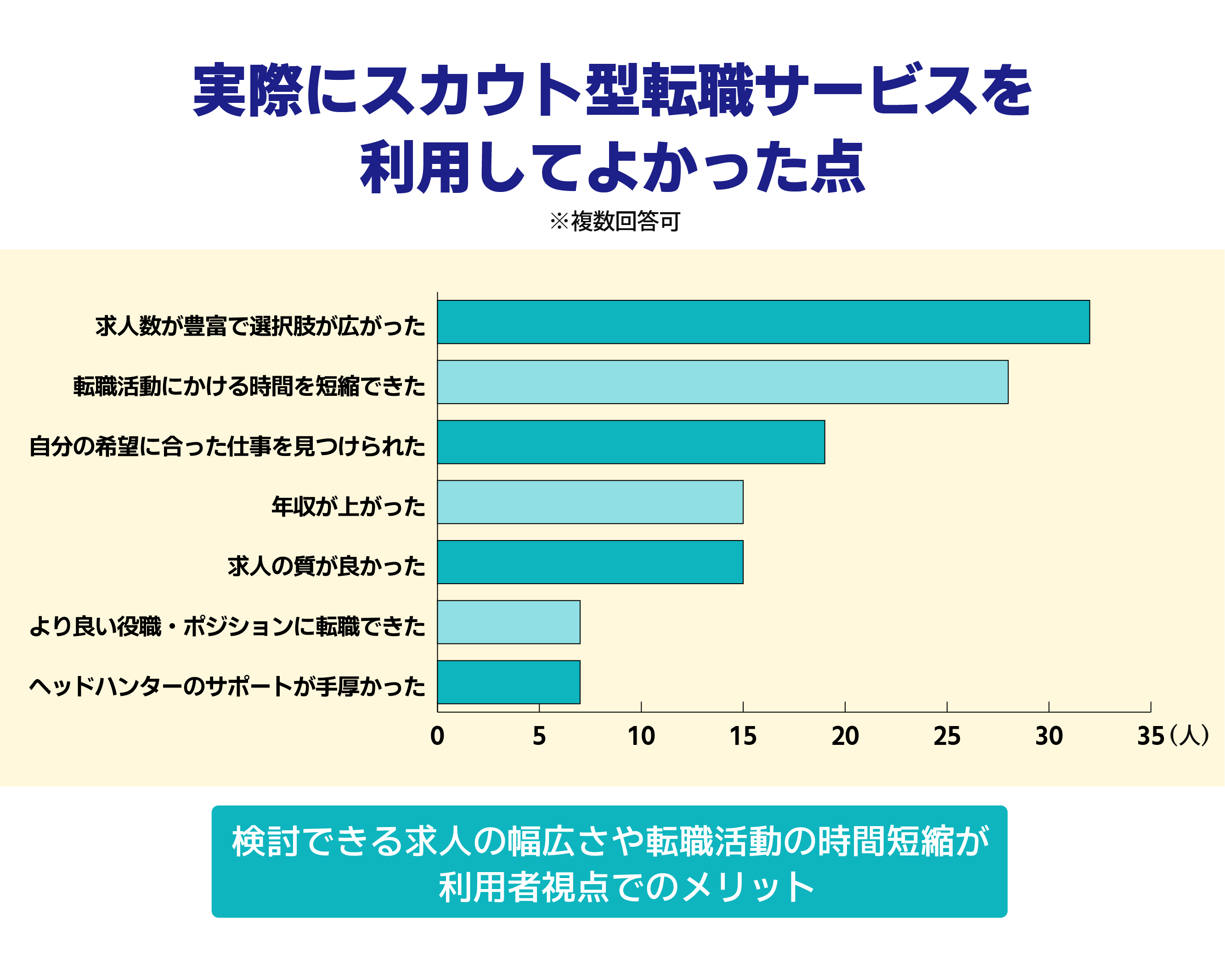 メリットとして多く挙がったのは「求人数が豊富で選択肢が広がった」32名(28%)、「転職活動にかける時間を短縮できた」28名(23%)でした。