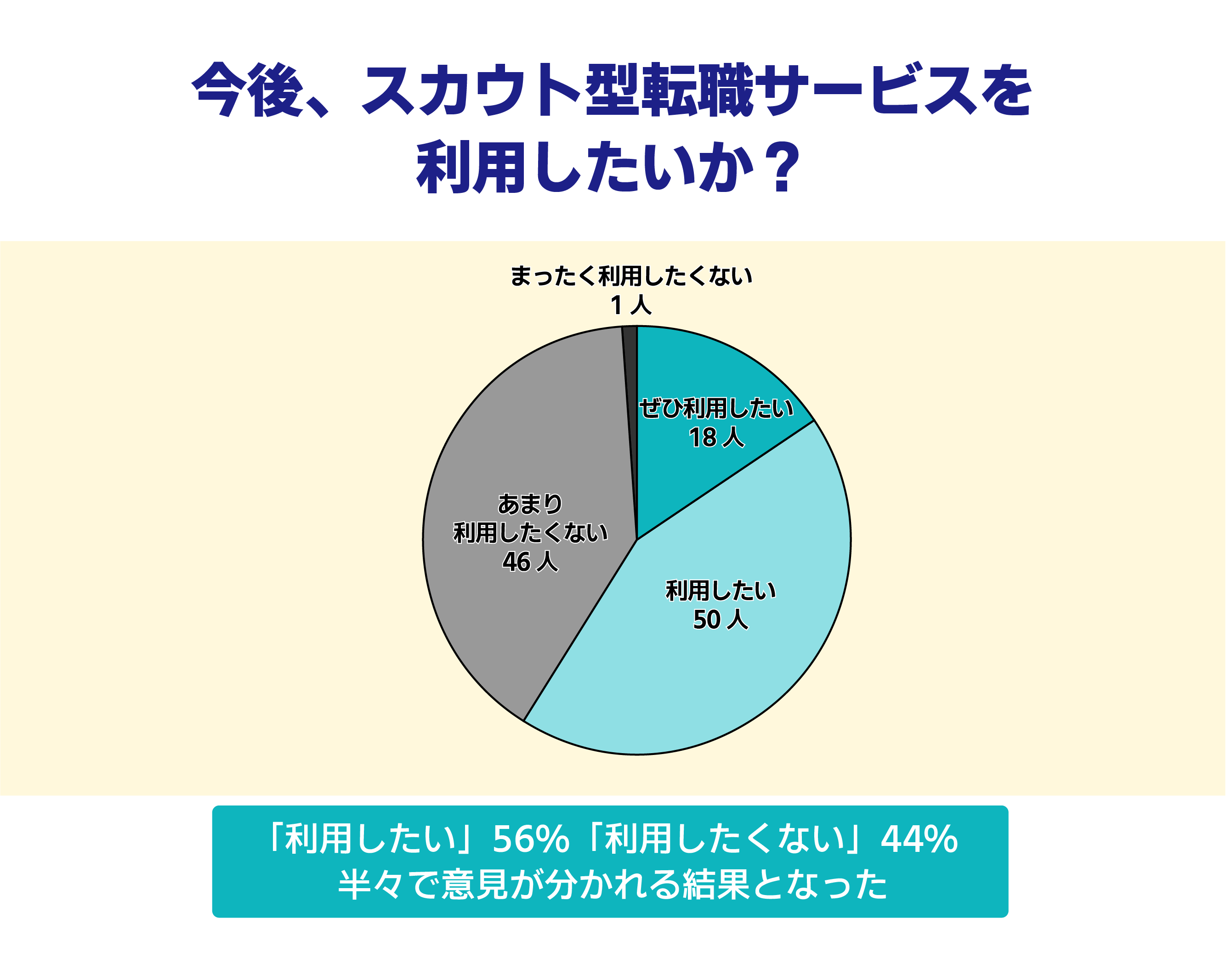 スカウト・オファー型転職サービスの利用経験を問わず、今後サービスを「ぜひ利用したい」「利用したい」と回答した層は120人中68人(56%)でした。