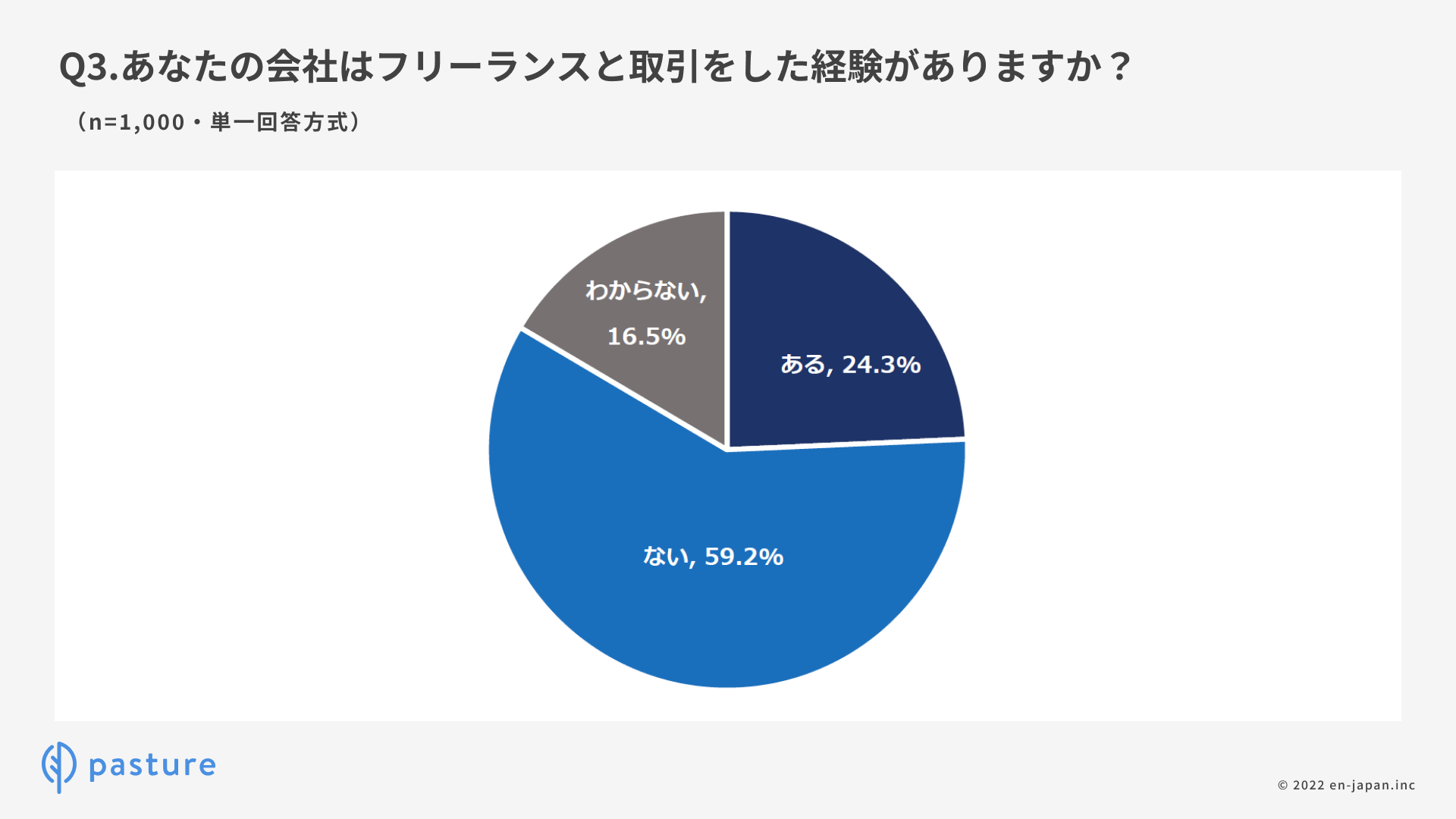 次に、自身の勤務先はフリーランスと取引をした経験があるか質問したところ、24.3%が「ある」、59.2%が「ない」、16.5%が「わからない」と回答しました。