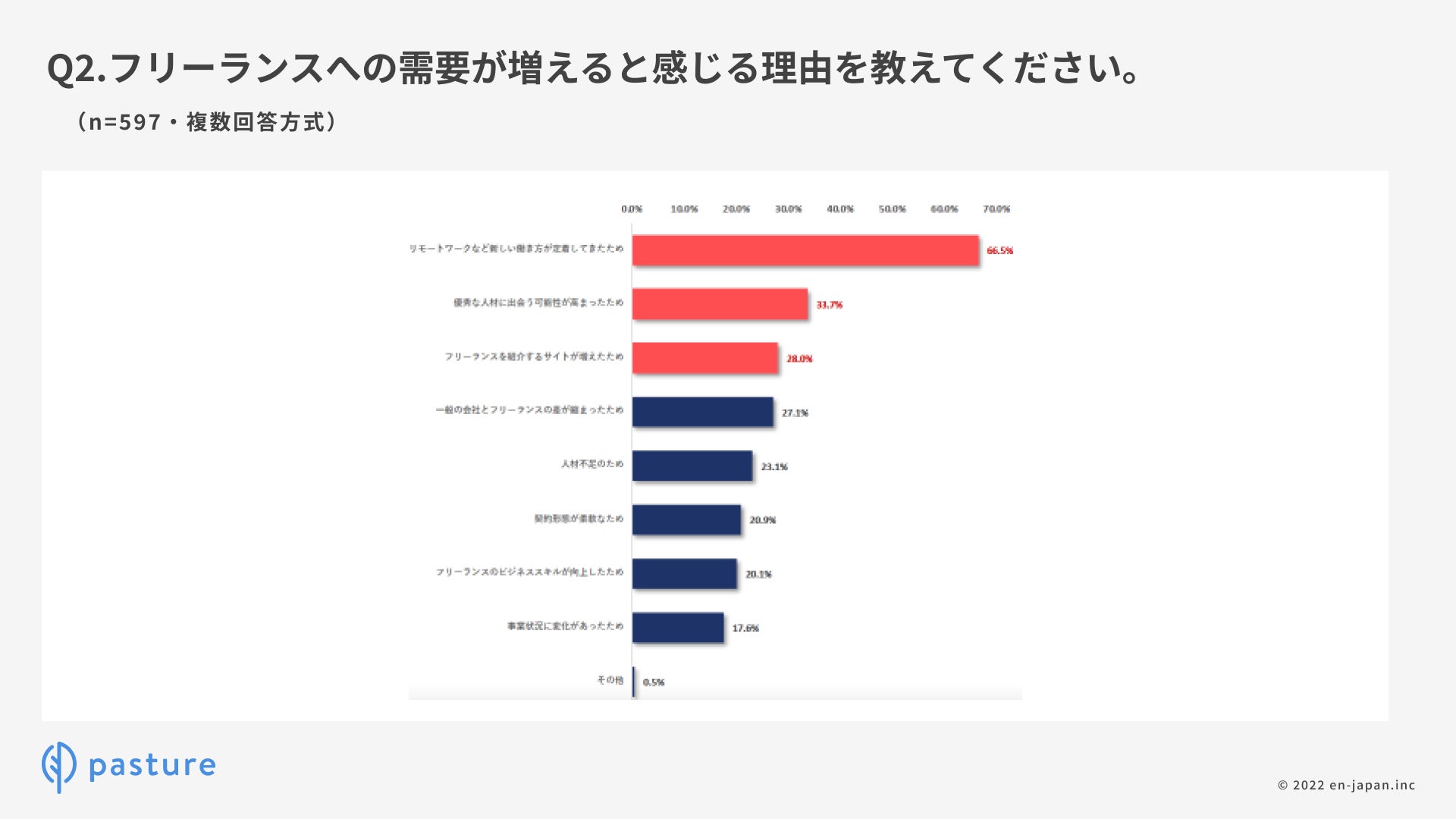 フリーランスの需要が増える理由、最多回答は「リモートワークなど新しい働き方が定着してきたため(66.5%)」