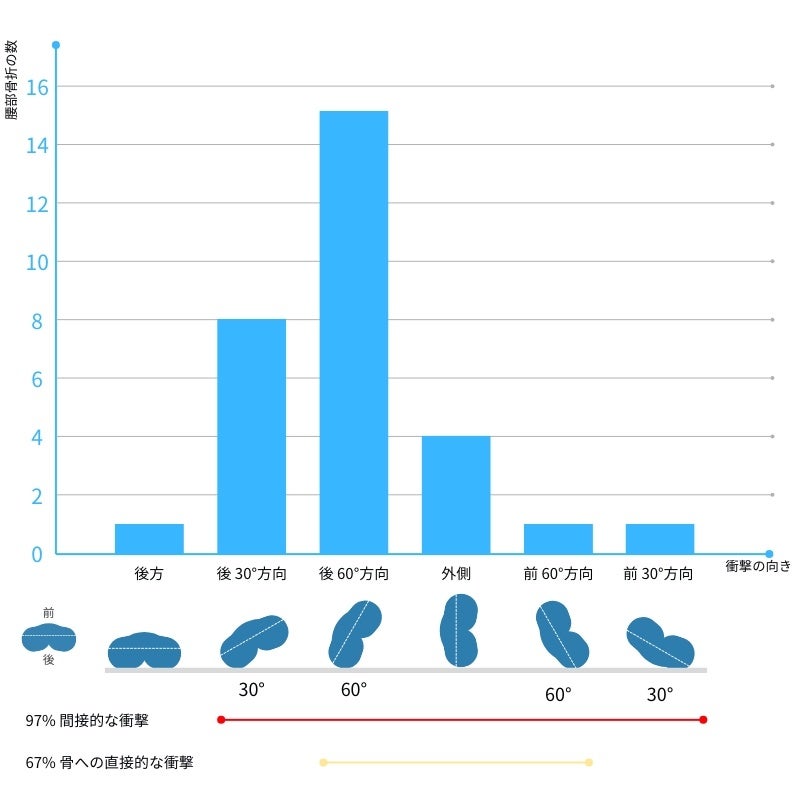 本製品のエアバッグは、ヒップ(股関節や大たい骨頭周辺)を効果的に保護します。この範囲を集中して保護する理由は、側面・外側への衝突を伴う転倒が、この骨折と最も関連していることが示されているためです。プロテクターを使用することは、こうした骨折の発生率を減少させ、効果的な予防策であると言えます。