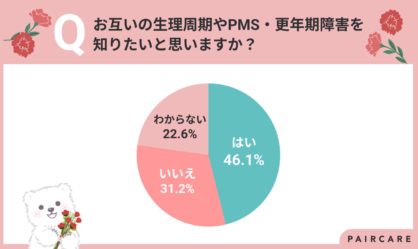 - お互いの生理周期やPMS・更年期障害を知りたいと思う女性は4割、知りたい理由は気遣いやサポートをしたい、またはしてほしいから
