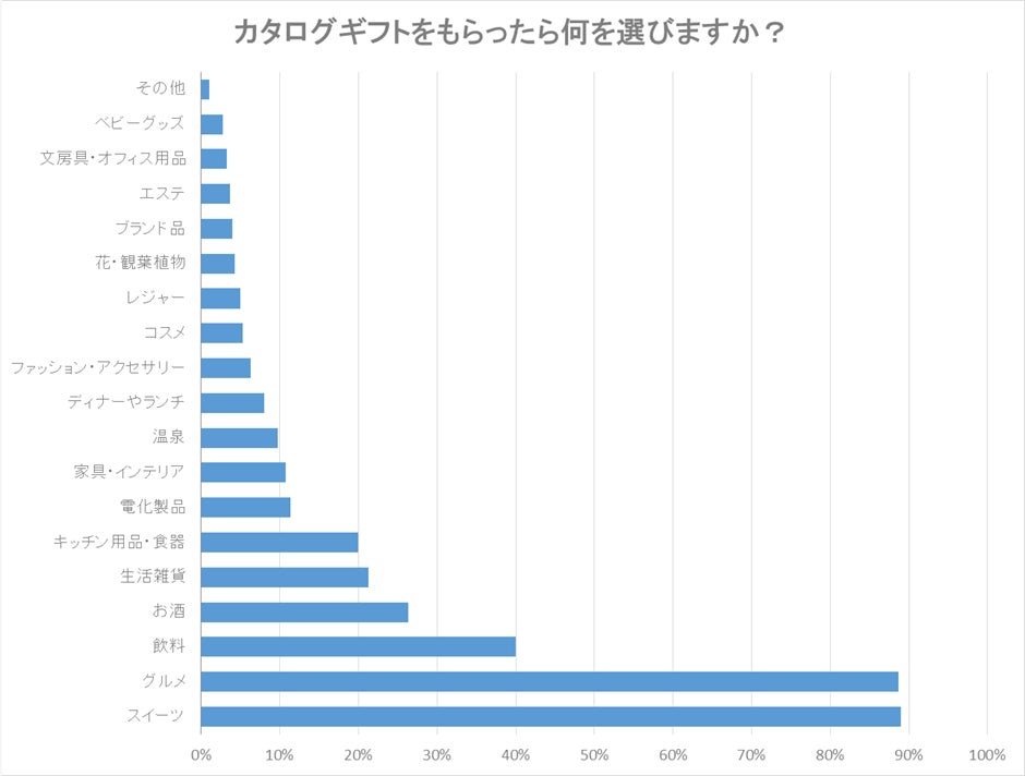「カタログギフトをもらったら何を選びますか?」という質問に対して、全体の89%の方が「スイーツ」「グルメ」と回答し、40%の「飲料」、26%の「お酒」、21%の「生活雑貨」が続く結果となりました。