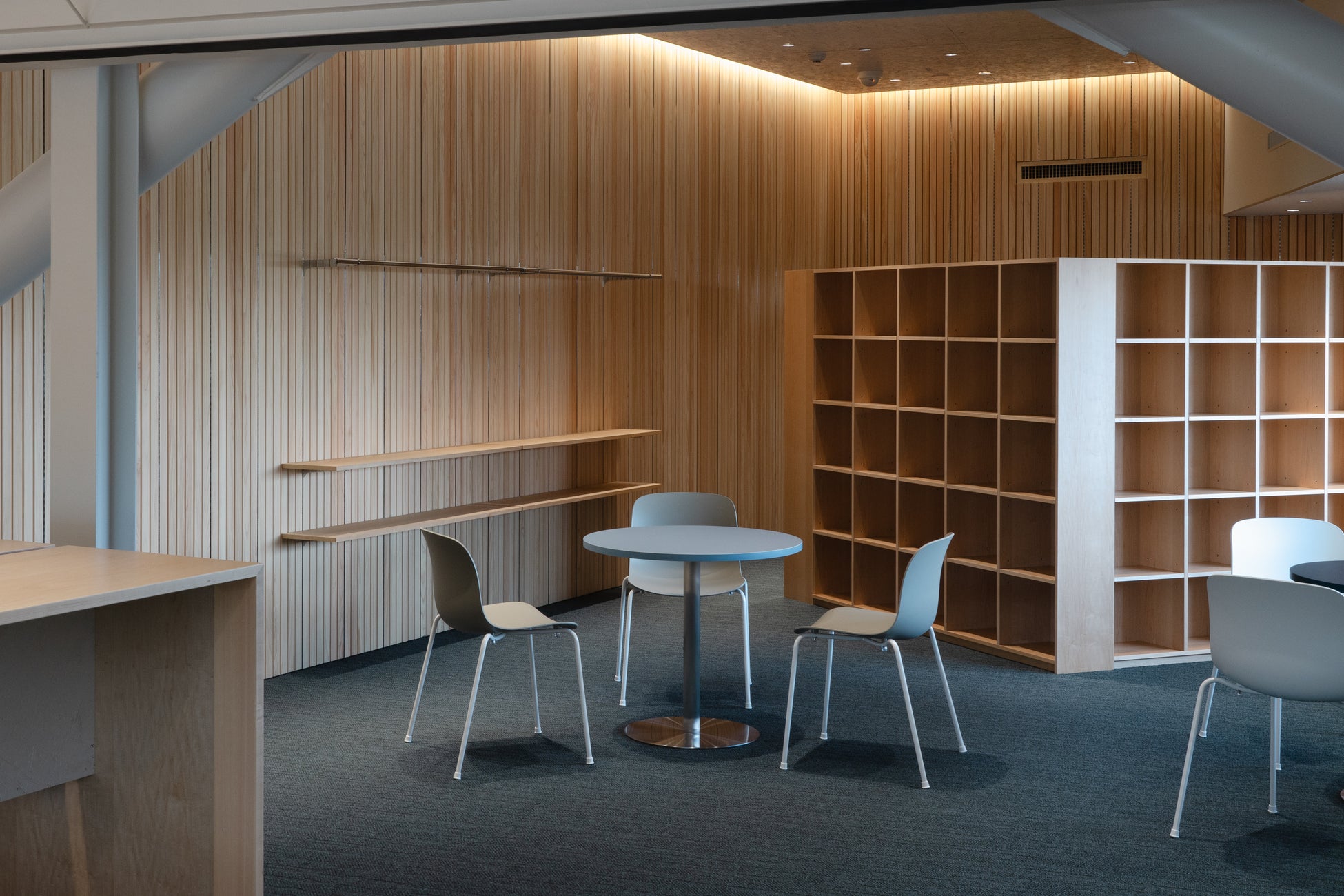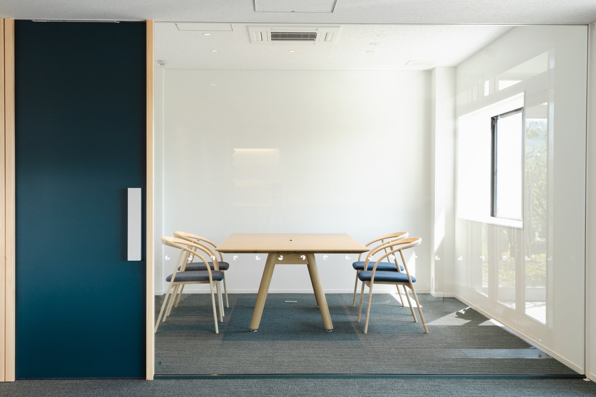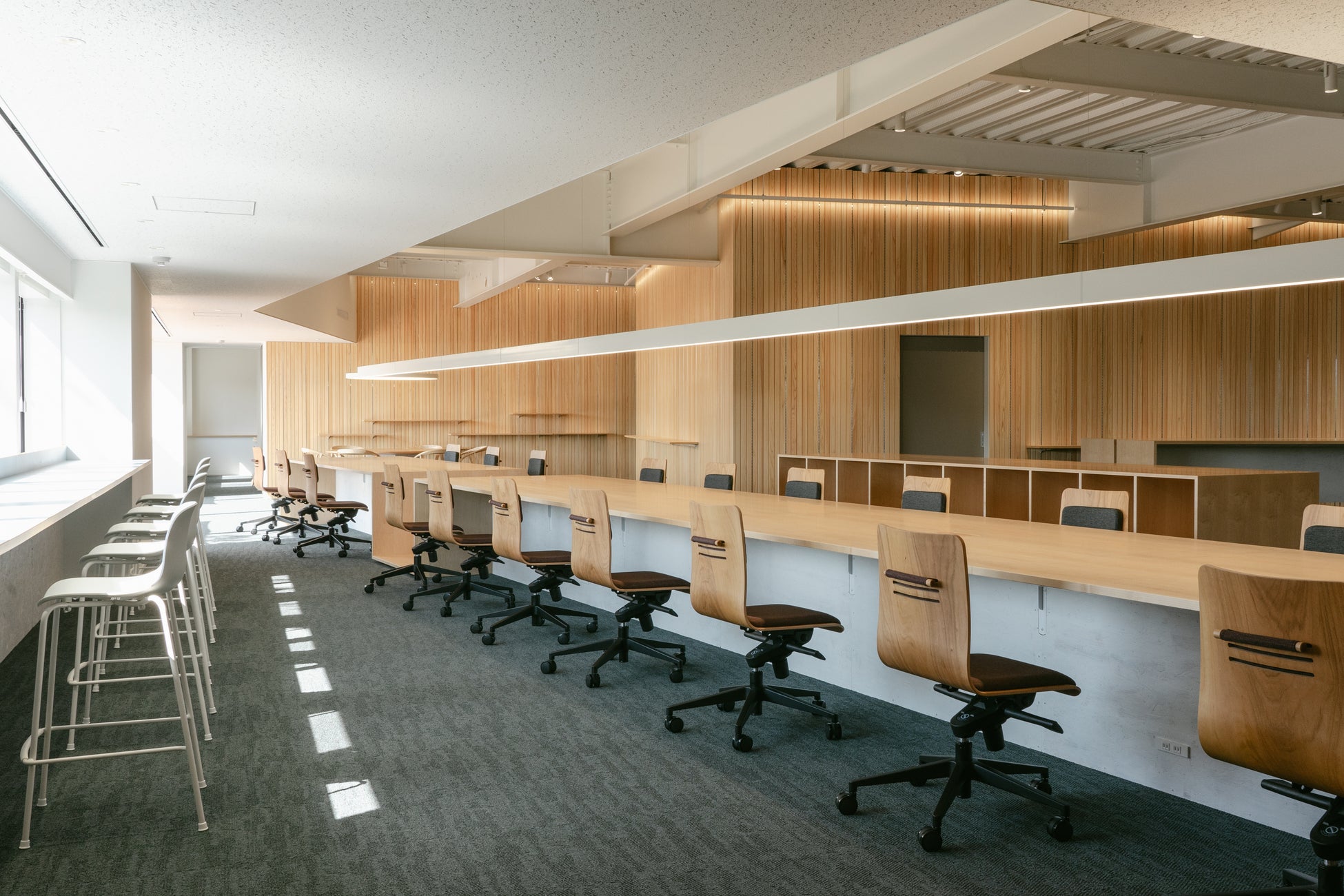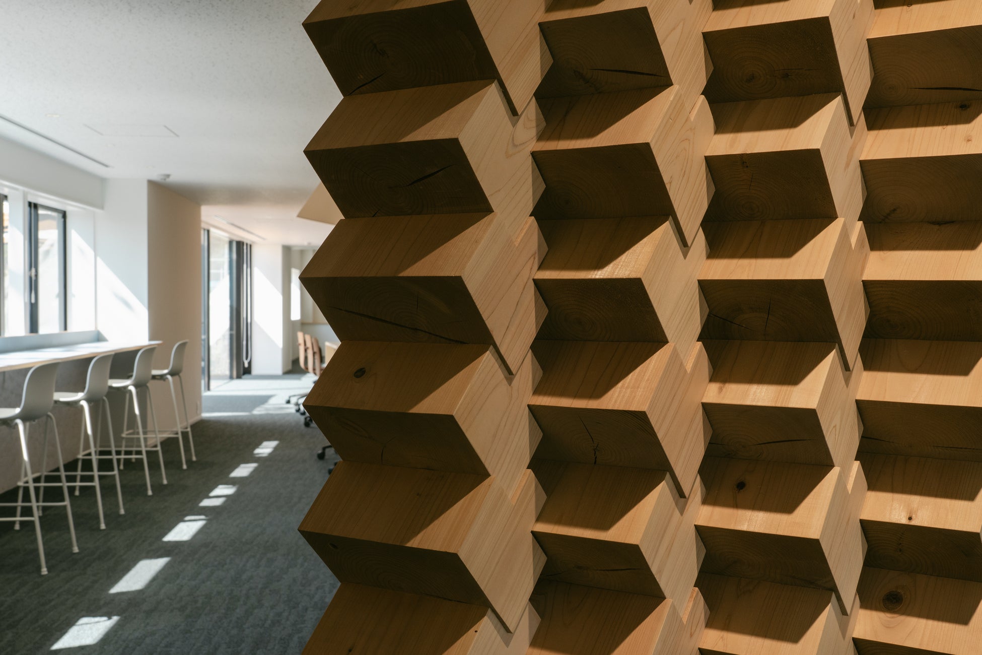 何度も協議を重ね、単に快適な環境にするだけでなく、従業員がワクワクするような、自然に人が集まりチームで明るく仕事に取り組めるような空間づくりにこだわった。正面玄関にそびえる木片のパーテーションや、可動式の棚やブラケットが取り付けられる木製の壁面が特徴的だ。