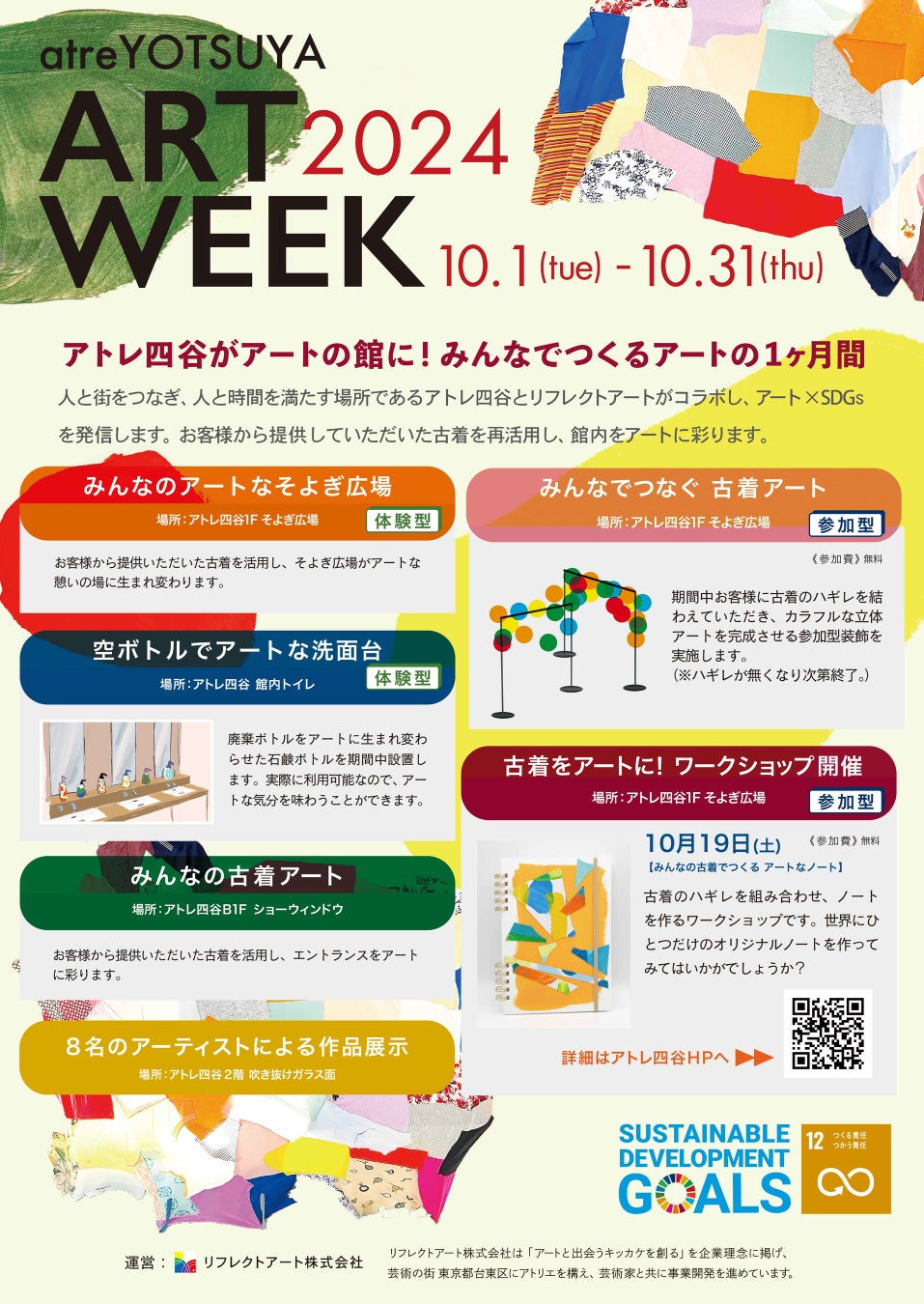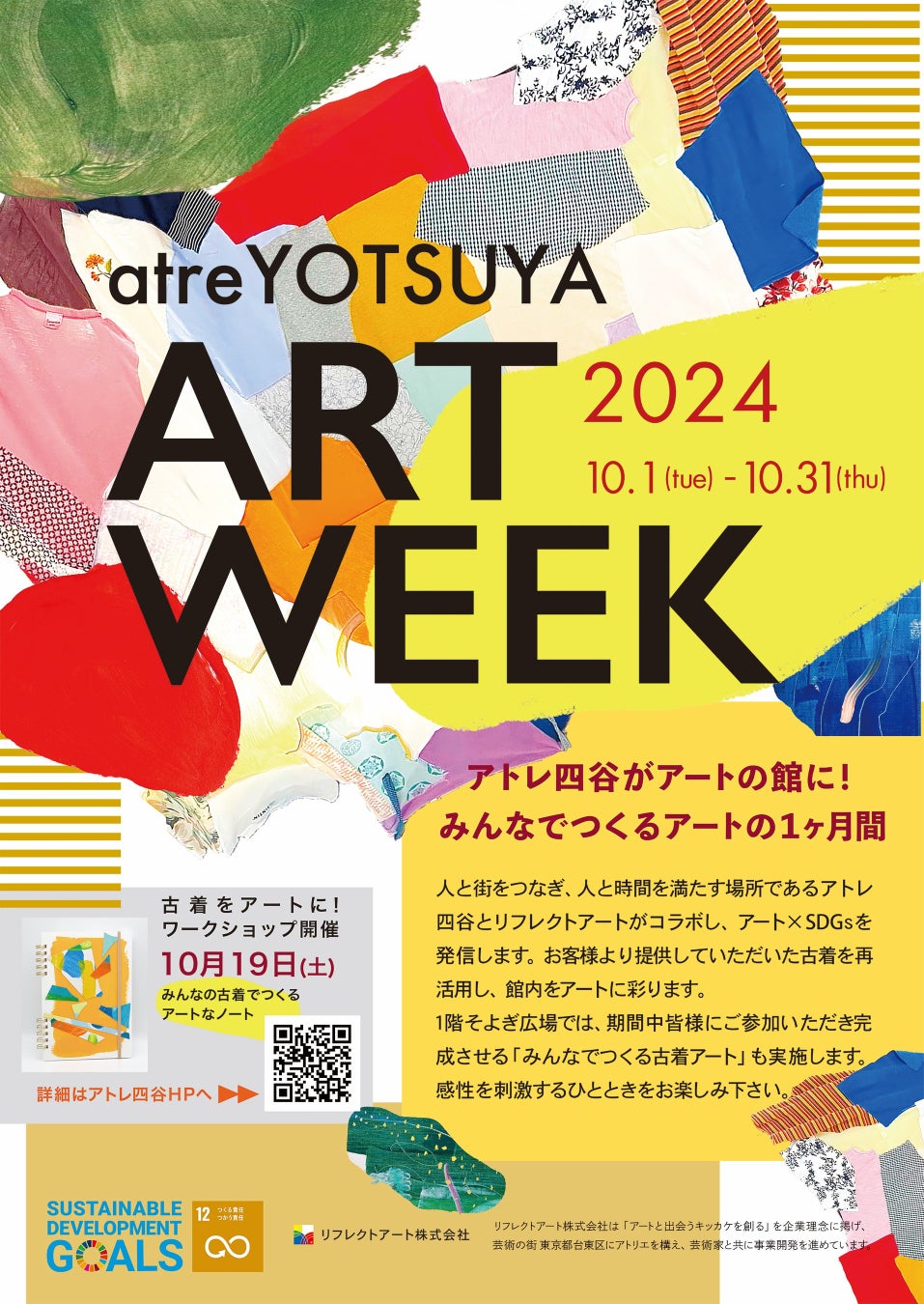 「アートと出会うキッカケをつくる」アートの総合会社であるリフレクトアート株式会社(代表取締役社長:福村彩乃)は、2024年10月1日(火)から31日(木)の期間、アトレ四谷にて【みんなでつくるatreYOTSUYA ART WEEK】と題し、お客様とプロのアーティストにより廃棄物を減らすアートな1カ月を展開します。お客様に提供していただいた古着を活用してプロのアーティストが館内装飾をしたり、古着のハギレを使ったワークショップを開催したり、期間中はアトレ四谷がアート一色に染まります。