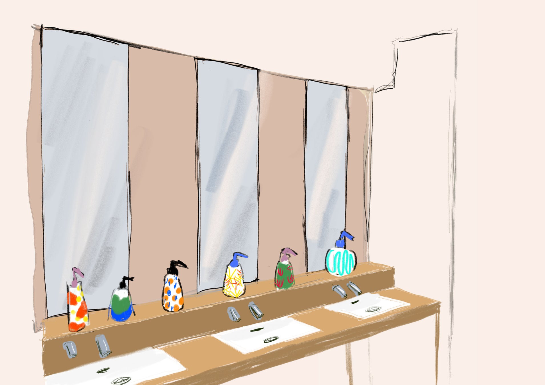 館内の化粧室では「アートな洗面台」として、廃棄ボトルをアートに生まれ変わらせた石鹸ボトルを期間中設置します。実際に利用可能なので、アートな気分を味わうことができます。
