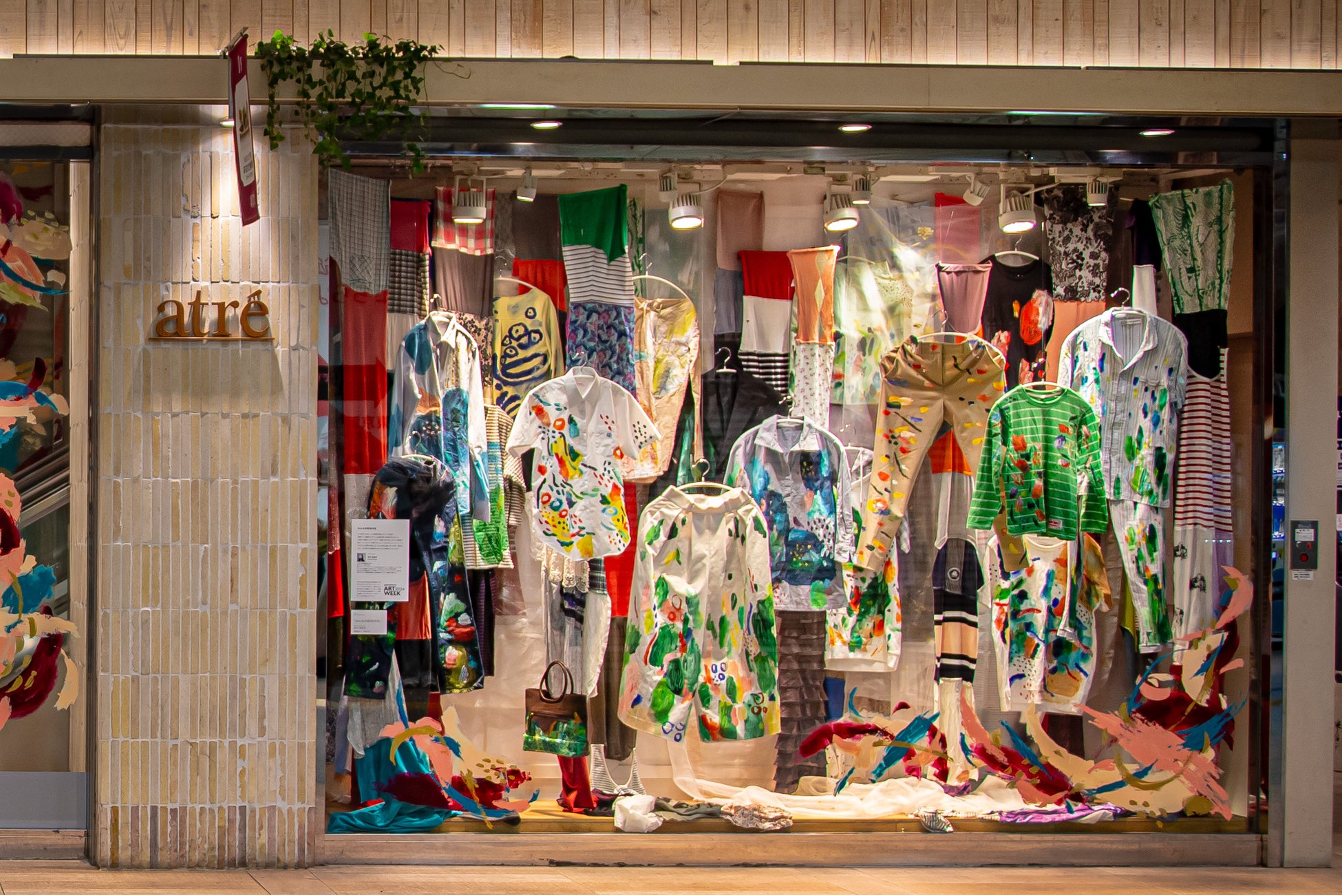 B1Fショーウィンドウでは古着を活用した作品を展示。この古着は、事前にアトレ四谷のお客様から回収したものを活用。古着をつなぎ合わせたり古着そのものに絵を描き装飾をしています。