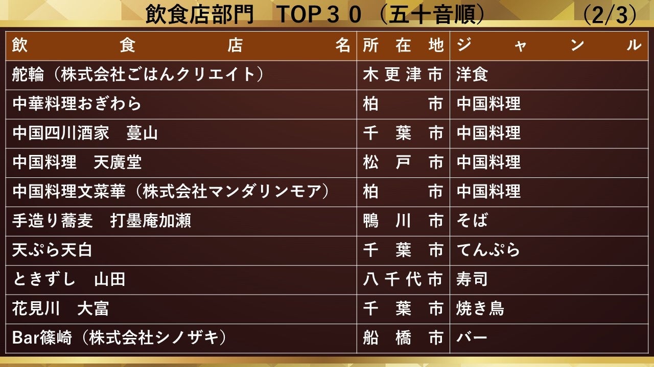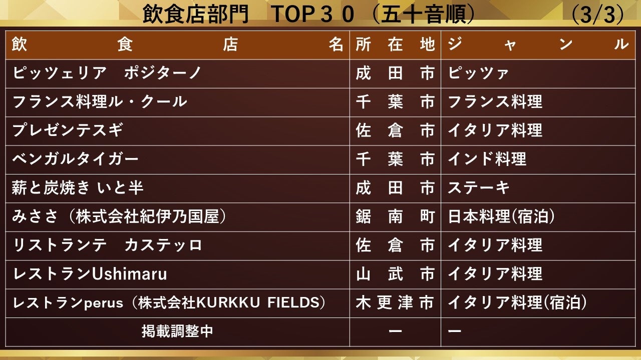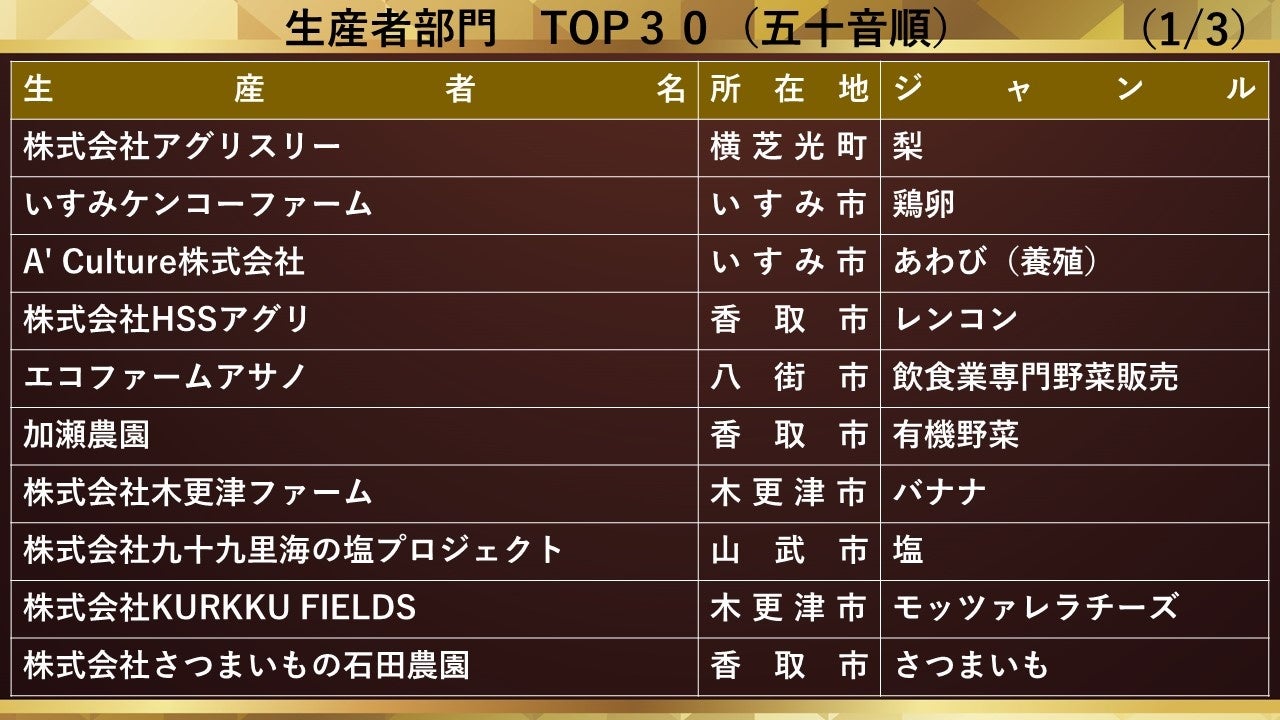 飲食店・生産者各部門のTOP30は以下の通りです。なお、掲載可否等調整中の事業者さまがおり、入れ替えはせずTOP30として表記しております。