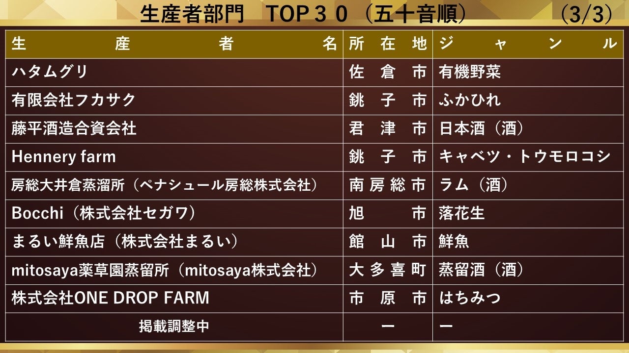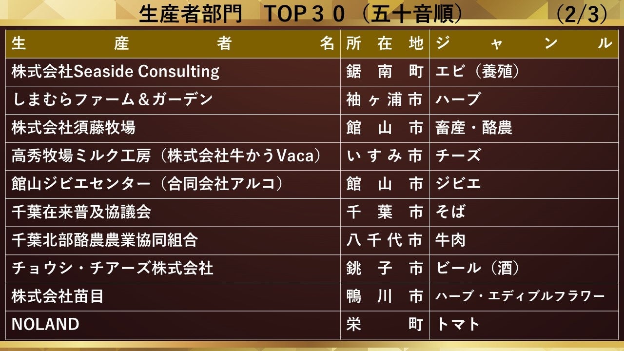 ちばガストロノミー県実行委員会(委員長:萩原勇作)は、2023年10月より実施しております「ちばガストロノミー県計画プロジェクト」で、今回、千葉県の飲食店さま・生産者さまからの自薦・他薦を含む500を超える応募の中から、厳正なる審査のもと、各部門において一次審査を通過したTOP30が決定したため発表致します。
