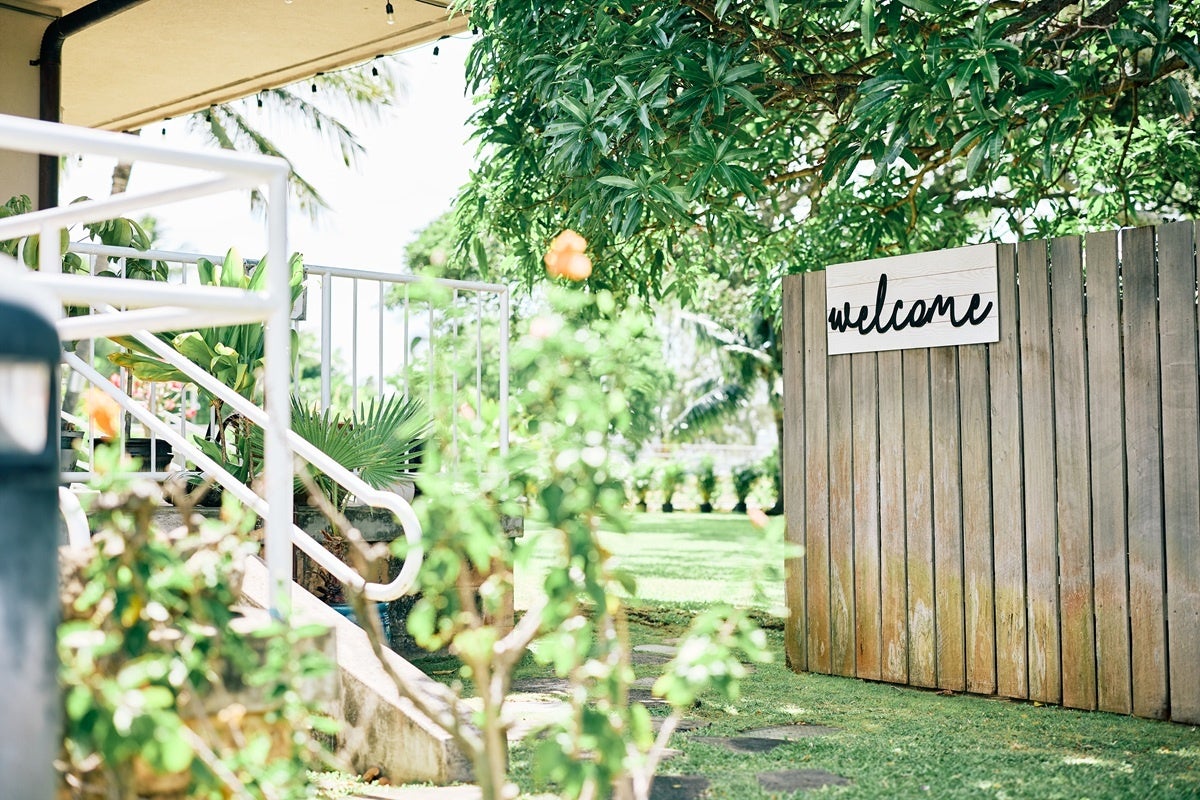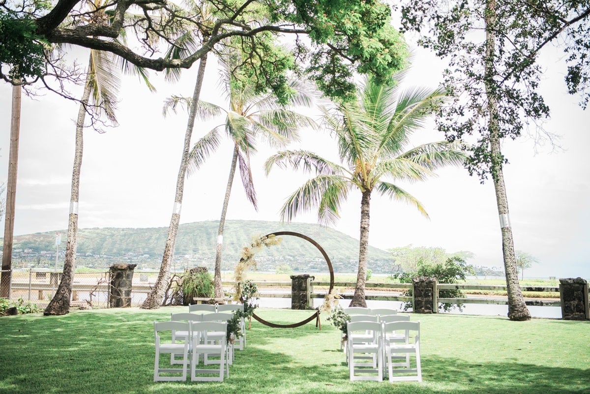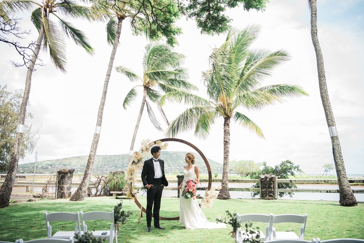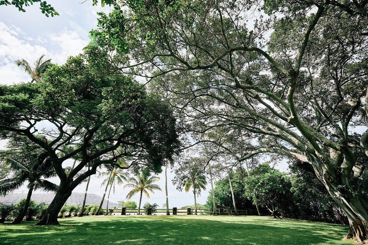 撮影会場となるザ・カイ・プライベートガーデンは、ワイキキから車で約30分、オアフ島東側のハワイカイエリアに位置するプライベートガーデンです。青々とした芝生、ハワイらしいヤシの木、存在感のあるバニアンツリーが特徴で、背景にはココヘッドの稜線が映り込みます。
