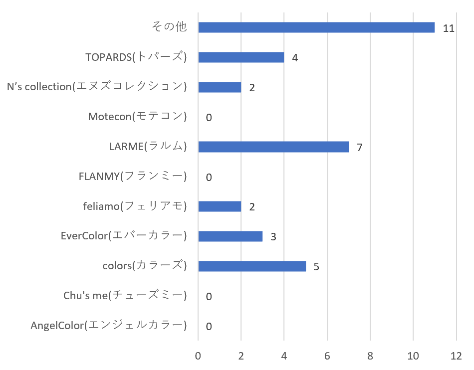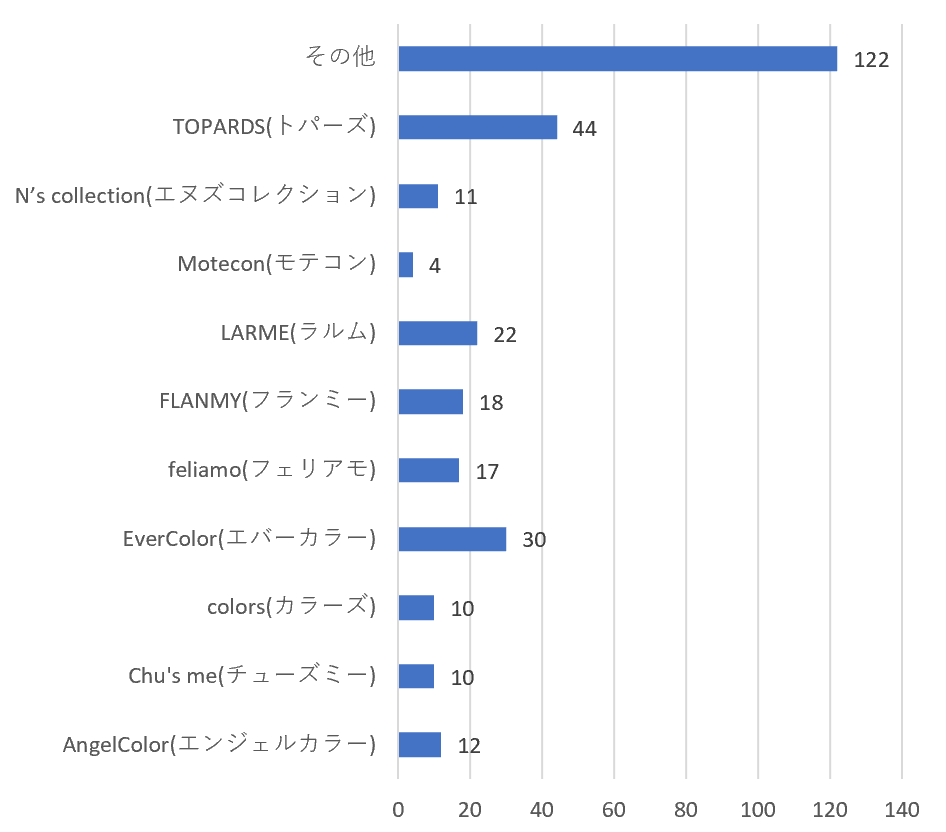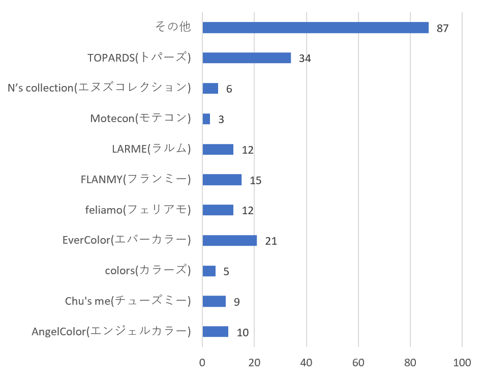 着目したいのは、「AngelColor(エンジェルカラー)」(https://www.queen-eyes.com/c/AngelColor/)や「Chu's me(チューズミー)」(https://www.queen-eyes.com/c/Chusme/)、「Motecon(モテコン)」(https://www.queen-eyes.com/c/Motecon/)といった「かわいらしさ」「モテ」を押し出したブランド名の商品についての回答数が0であったことです。