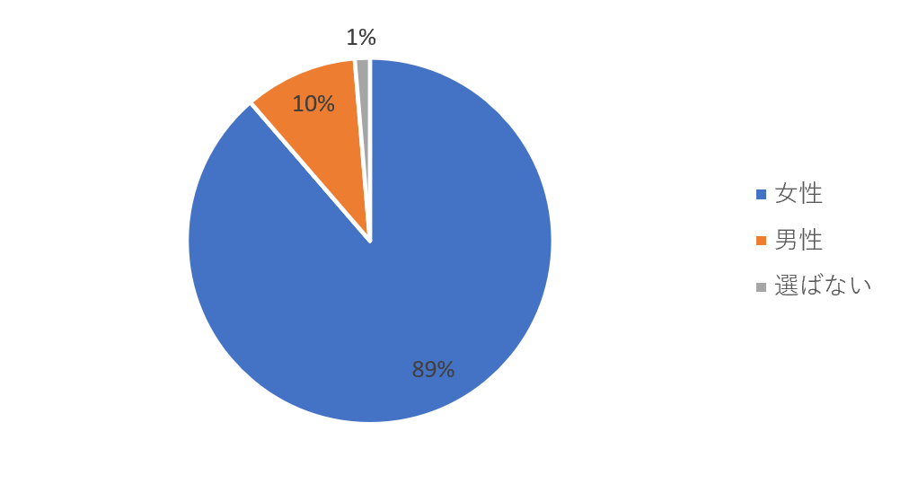 また性別については、89パーセントが「女性」、10パーセントが「男性」、残り1パーセントが「選ばない」と回答しました。